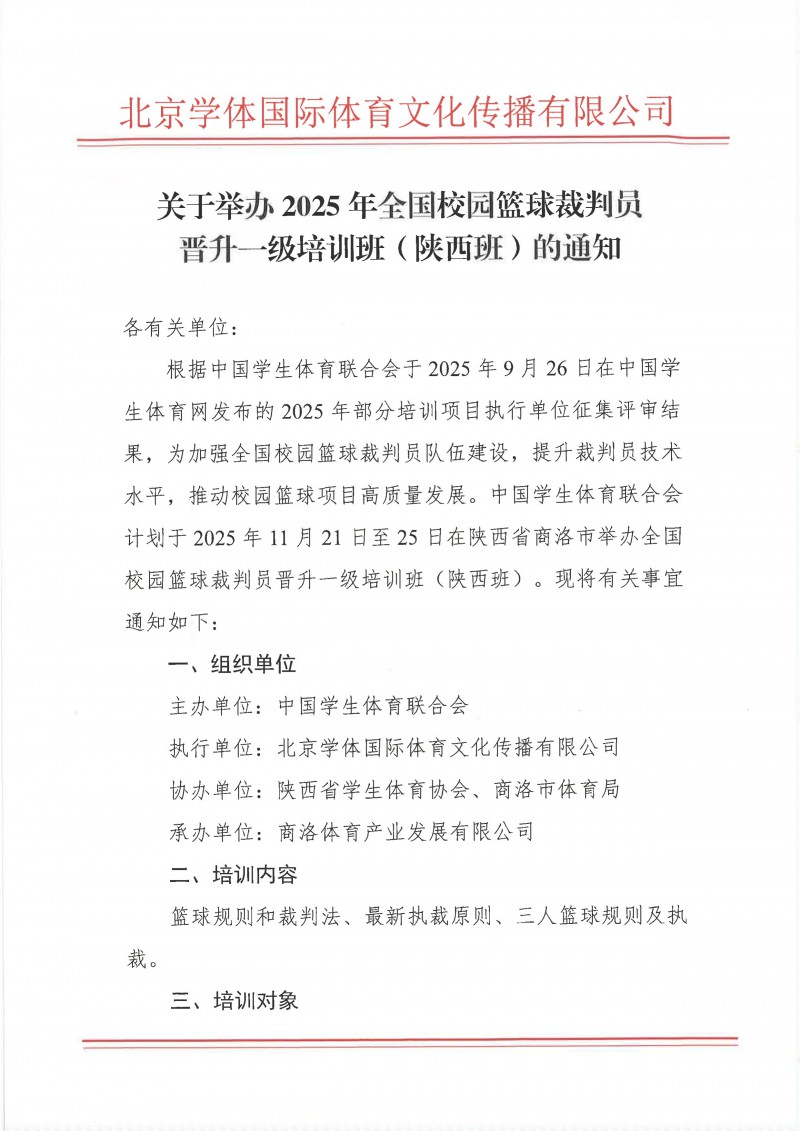 关于举办2025年全国校园篮球裁判员晋升一级培训班(陕西班)的通知