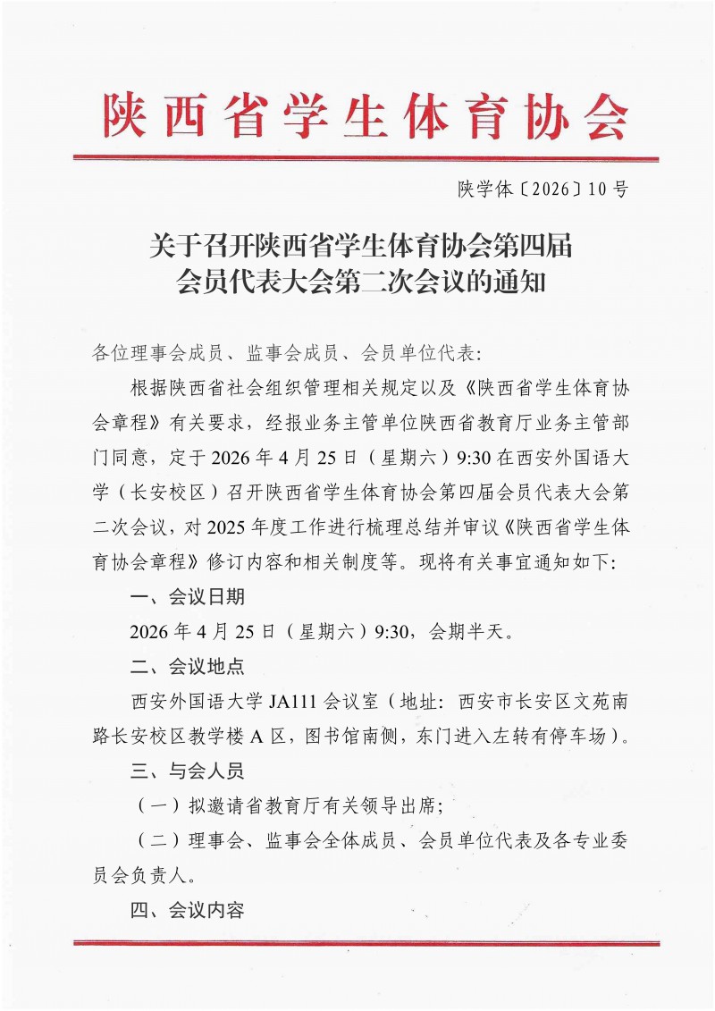 关于召开陕西省学生体育协会第四届会员代表大会第二次会议的通知
