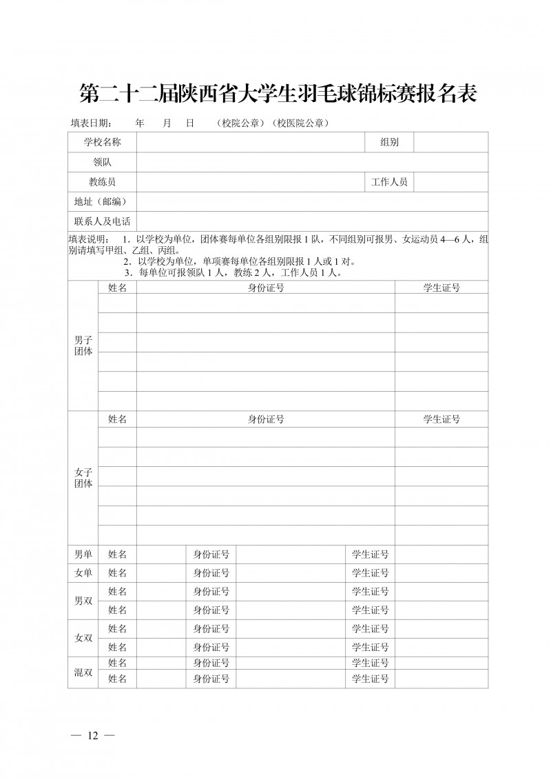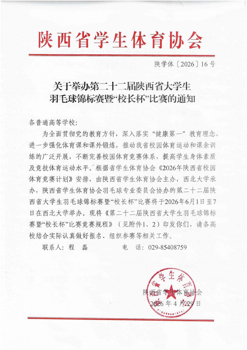 关于举办第二十二届陕西省大学生羽毛球锦标赛暨“校长杯”比赛的通知
