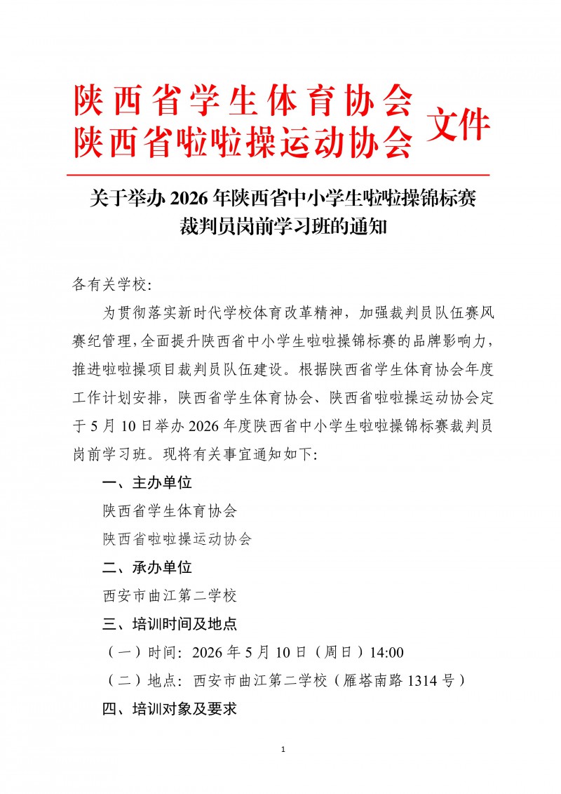 关于举办2026年陕西省中小学生啦啦操锦标赛裁判员岗前学习班的通知