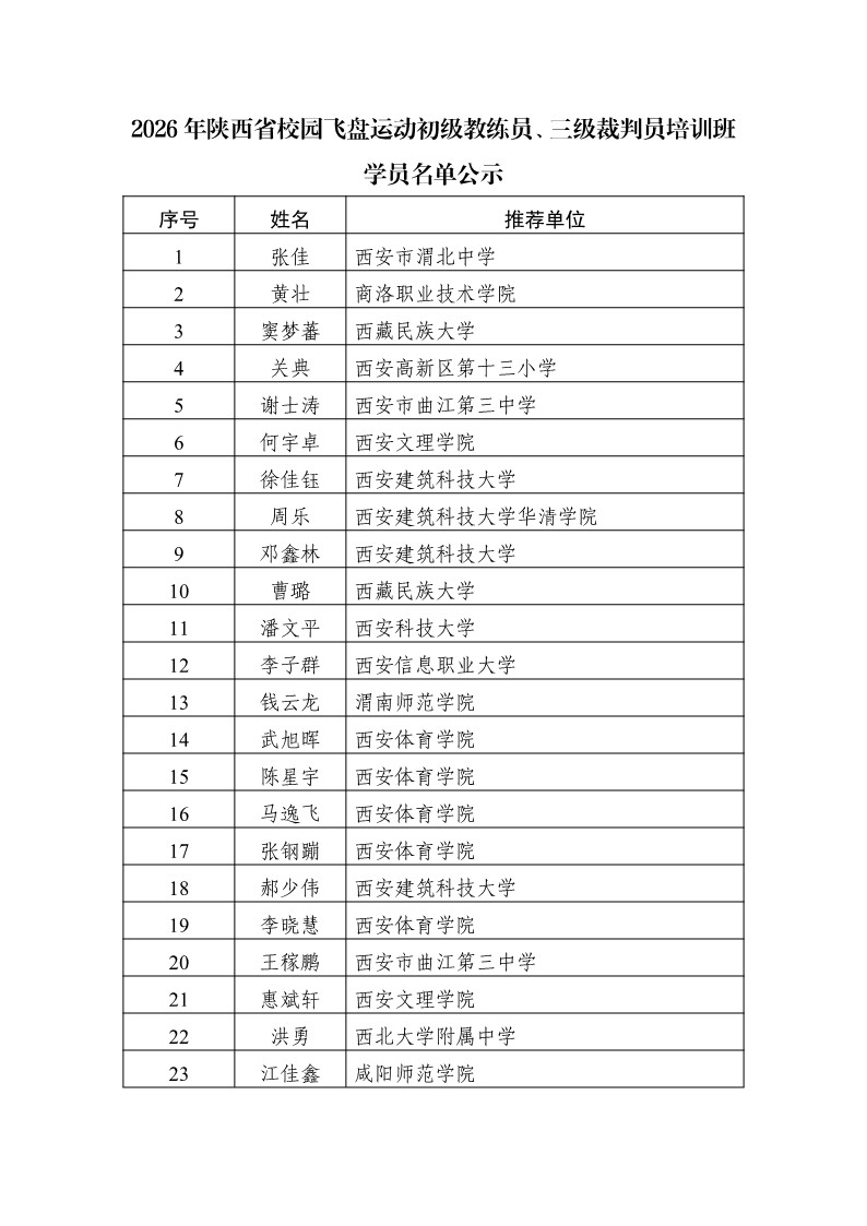 2026年陕西省校园飞盘运动初级教练员、三级裁判员培训班学员名单公示
