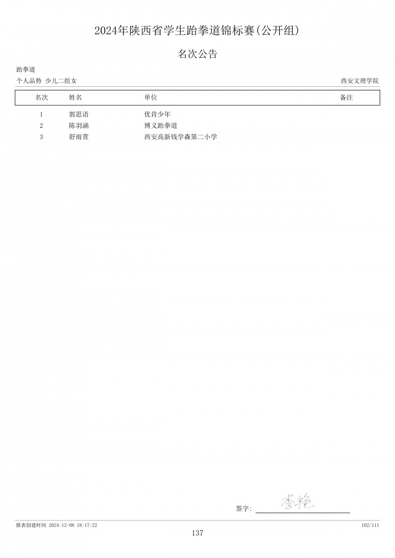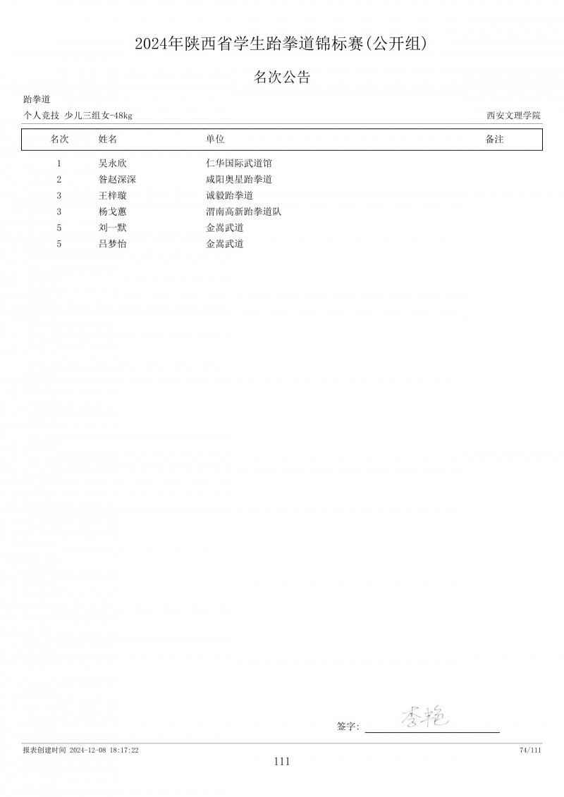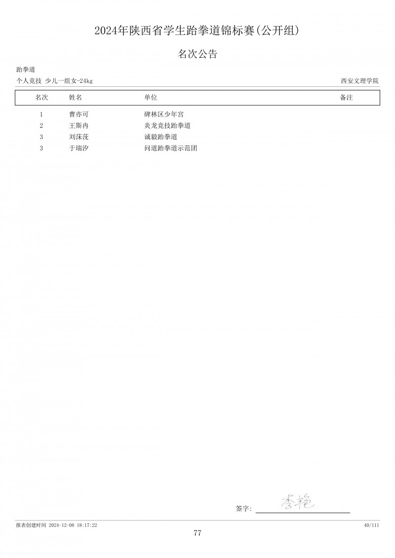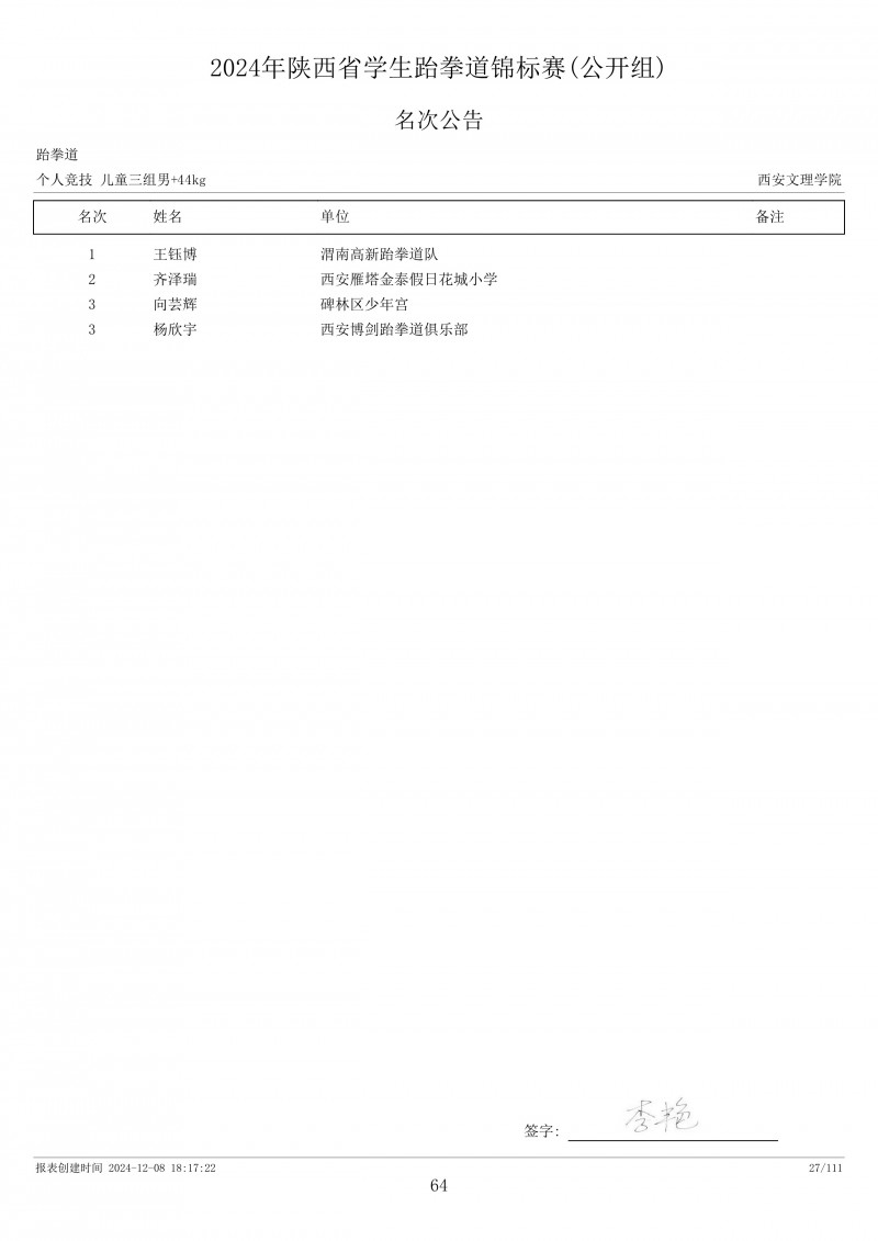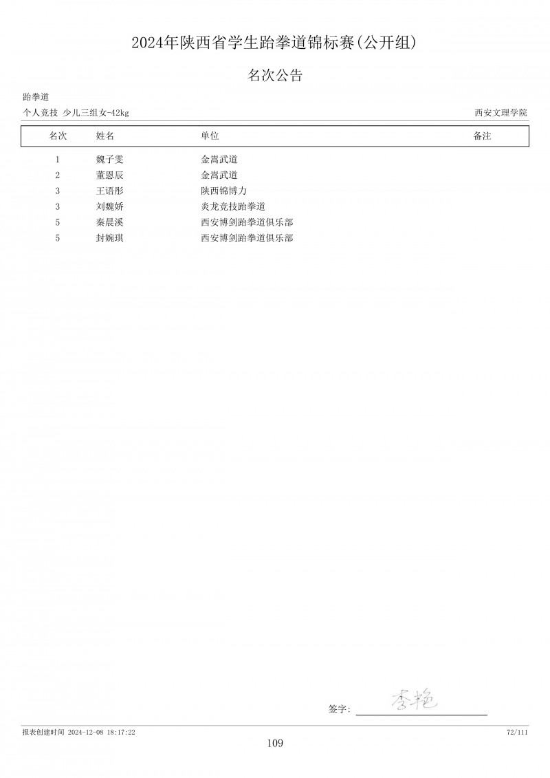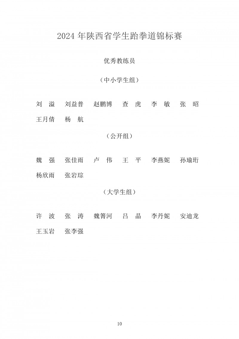 2024年陕西省学生跆拳道锦标赛成绩册