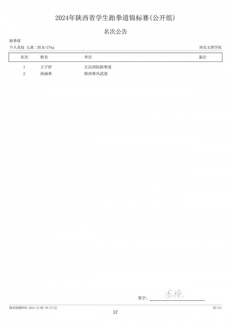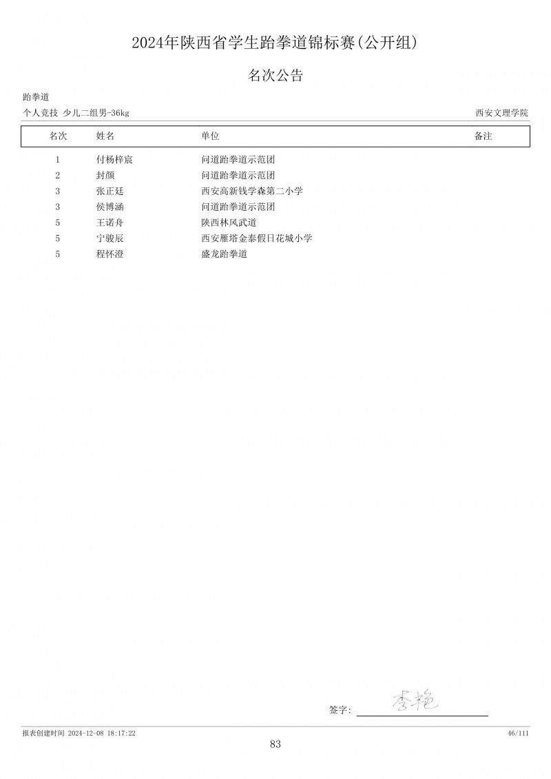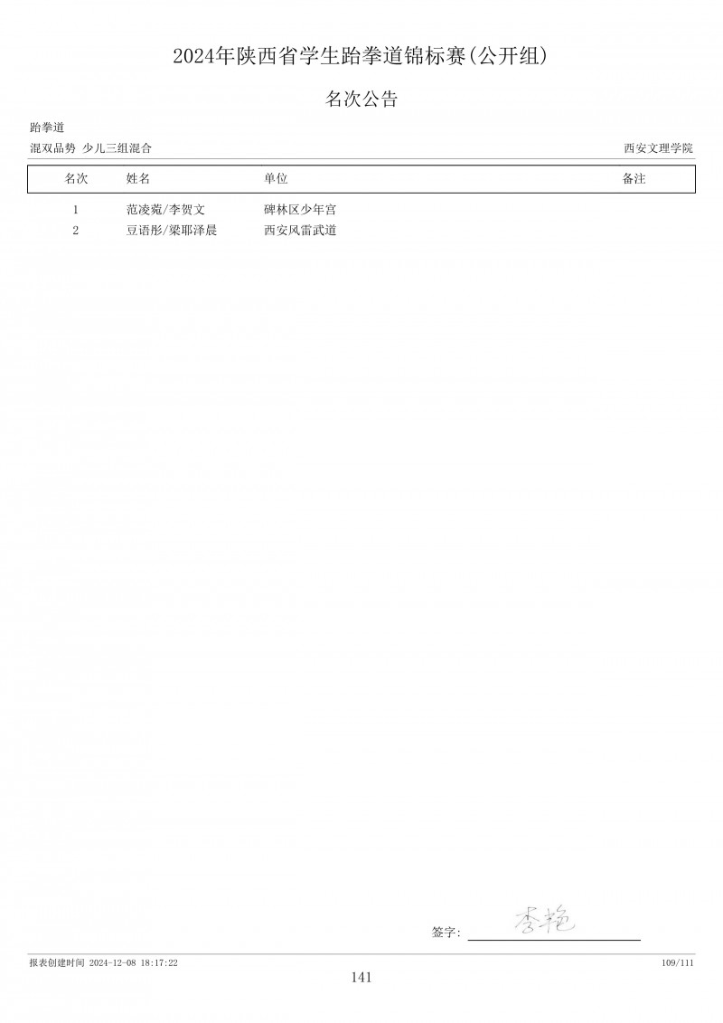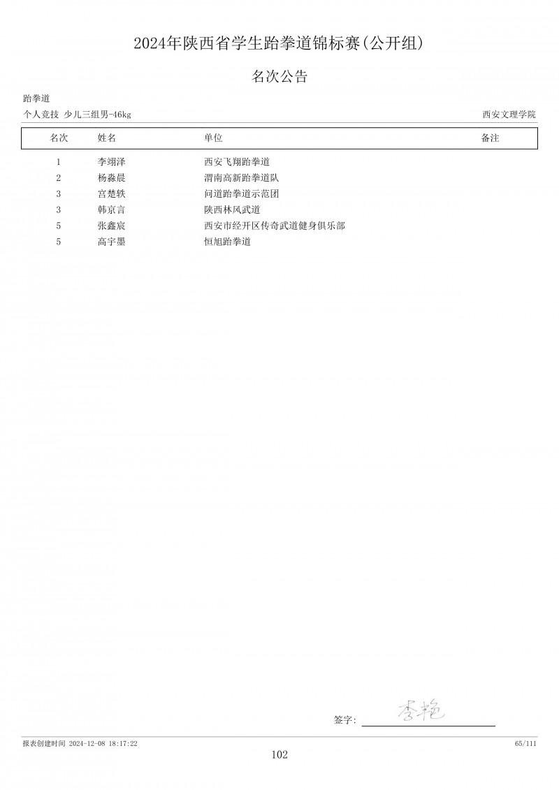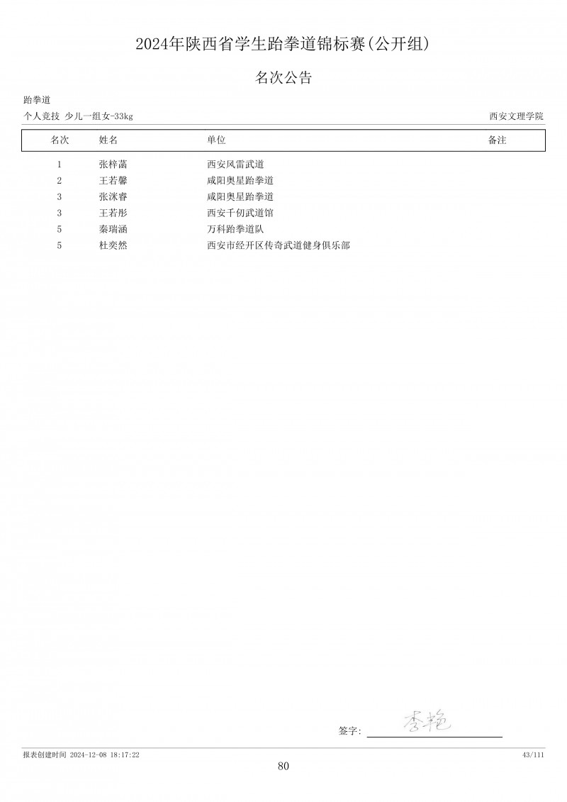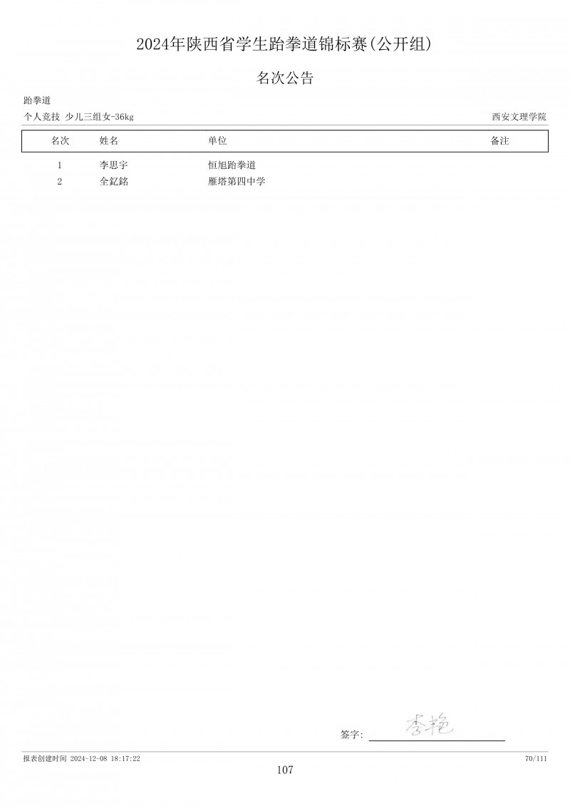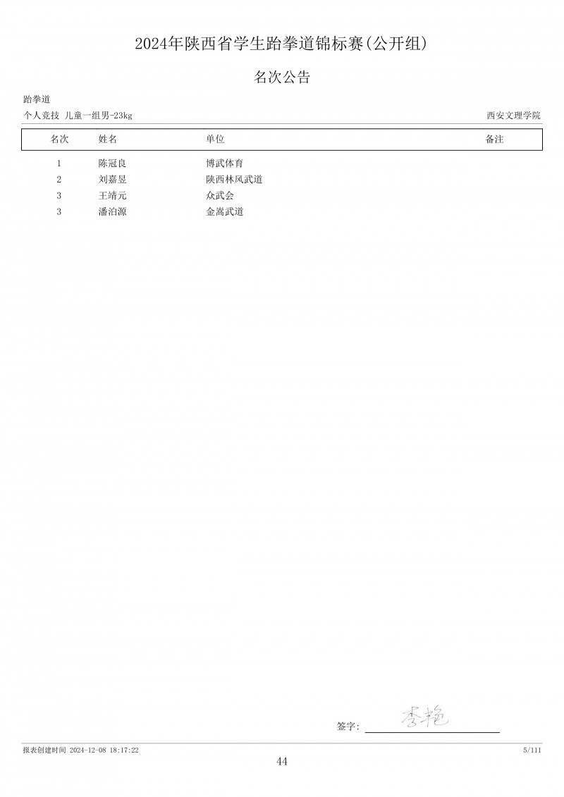 2024年陕西省学生跆拳道锦标赛成绩册