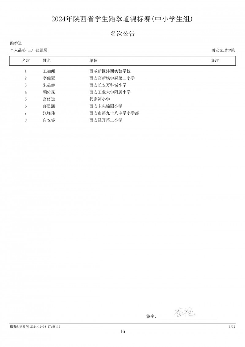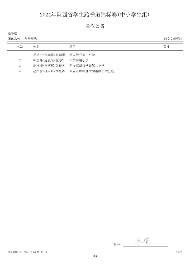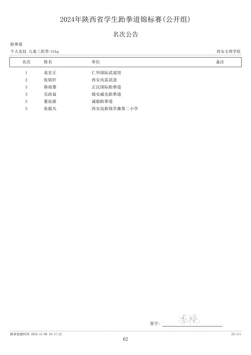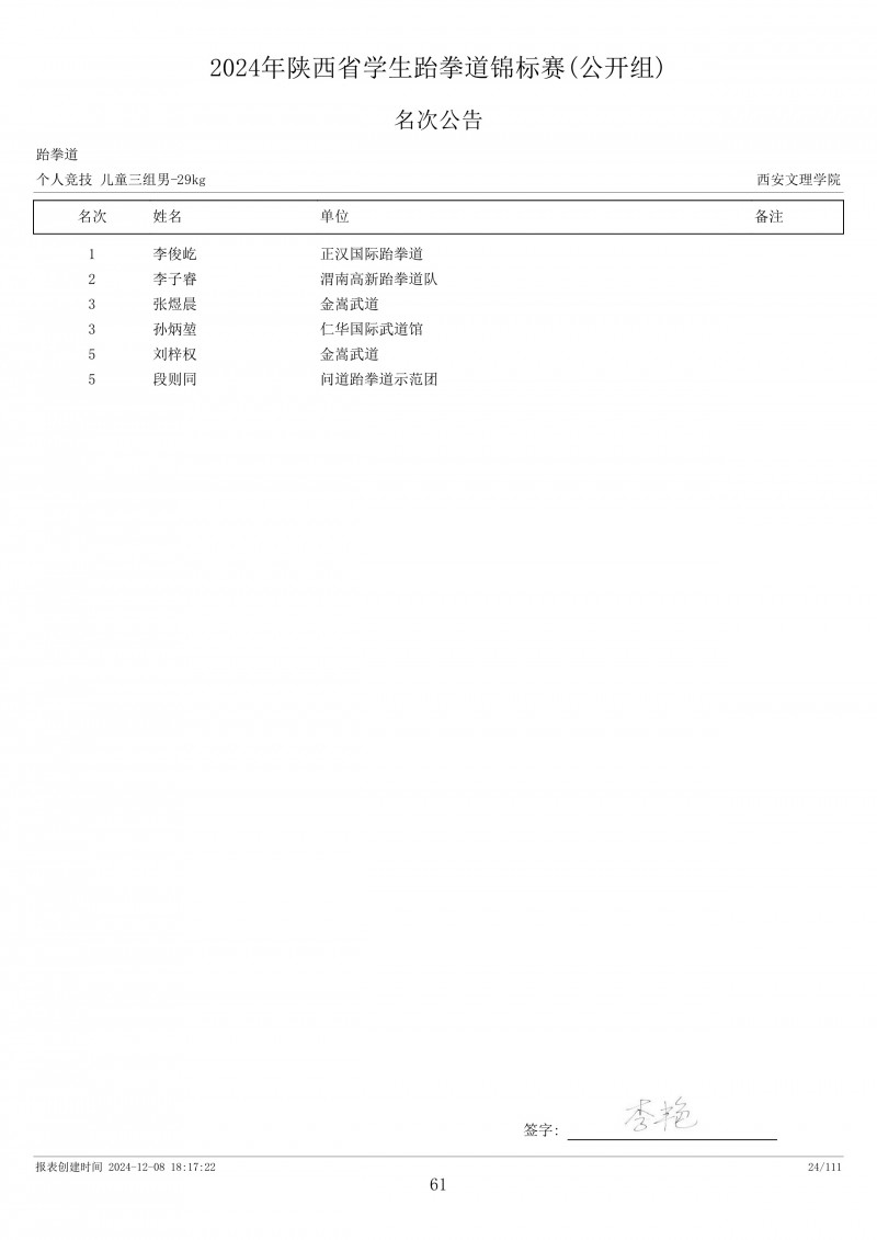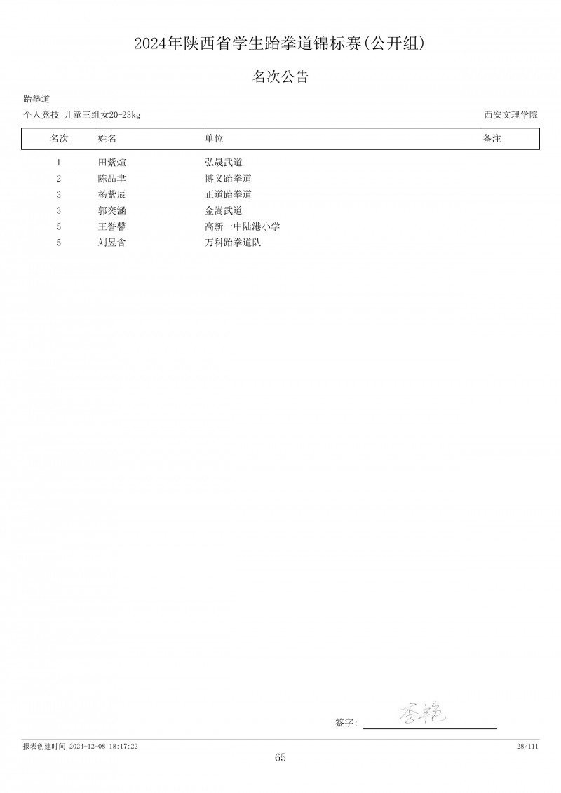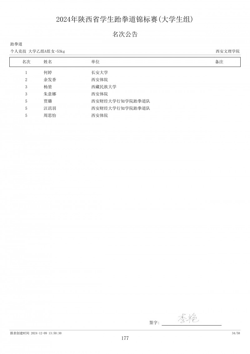 2024年陕西省学生跆拳道锦标赛成绩册