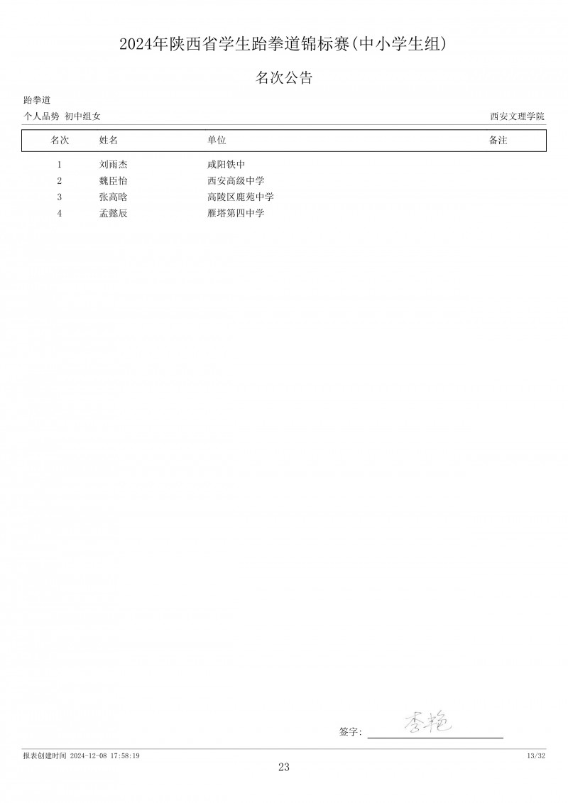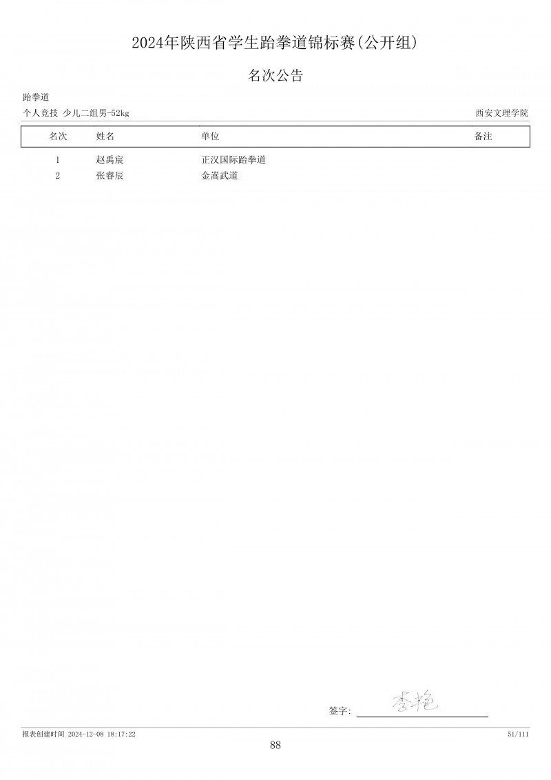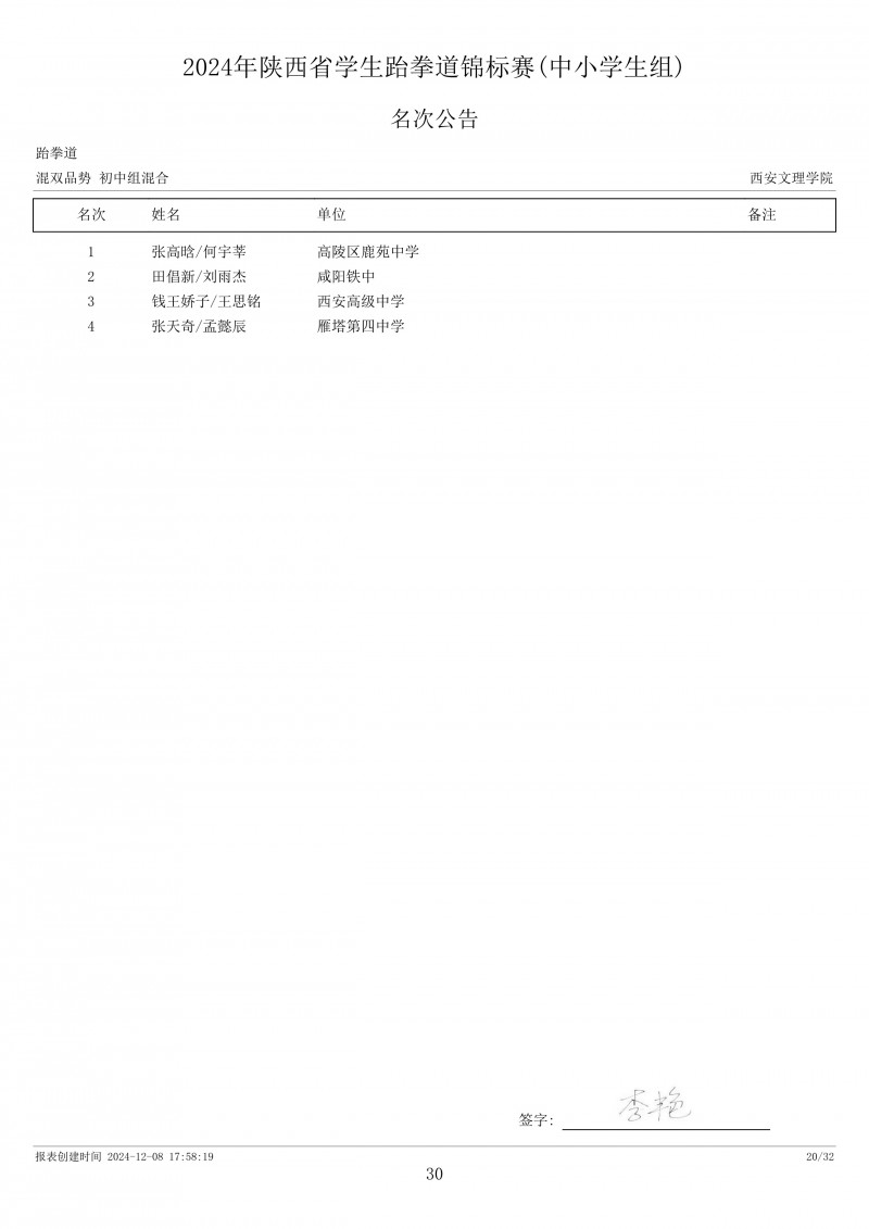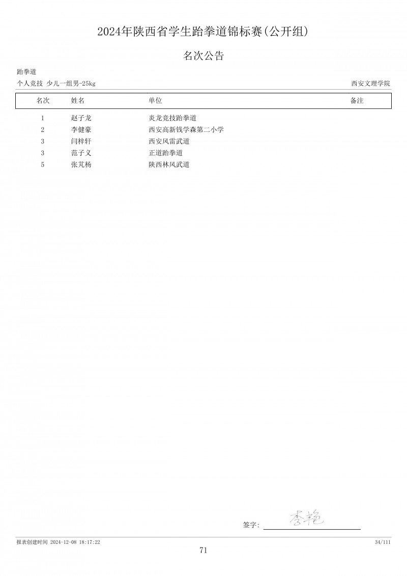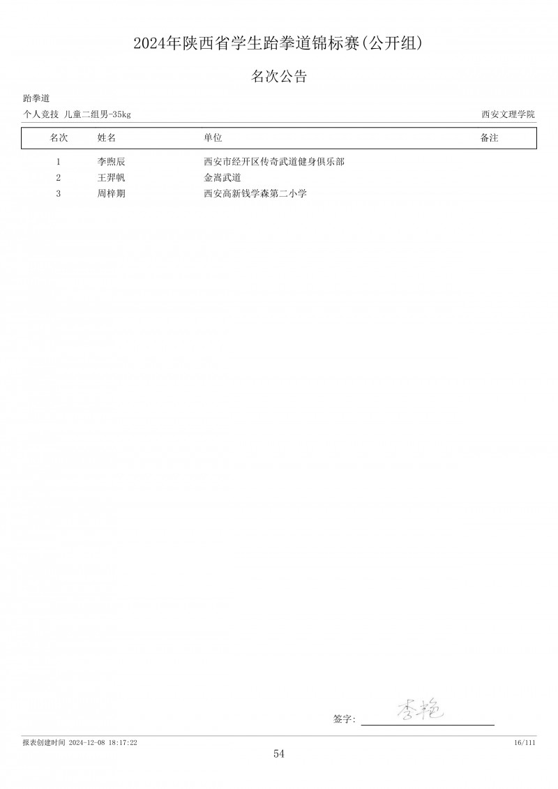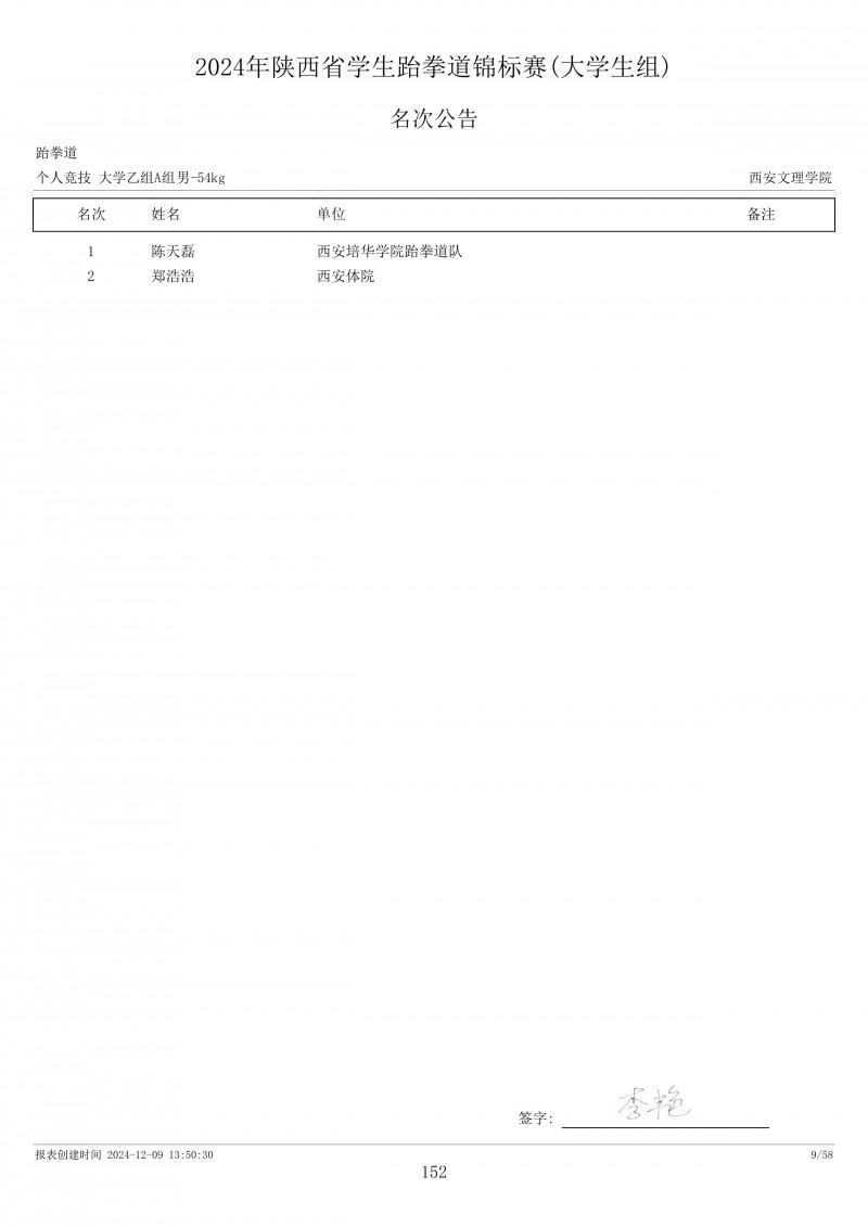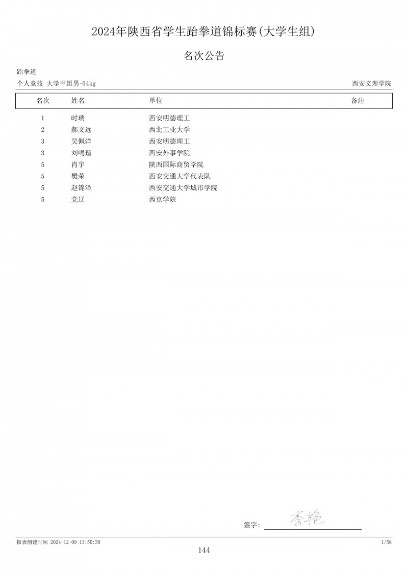2024年陕西省学生跆拳道锦标赛成绩册