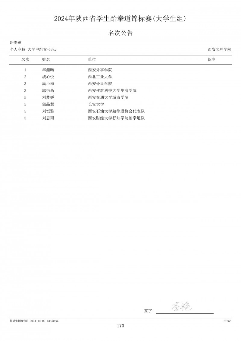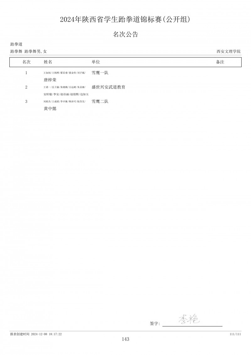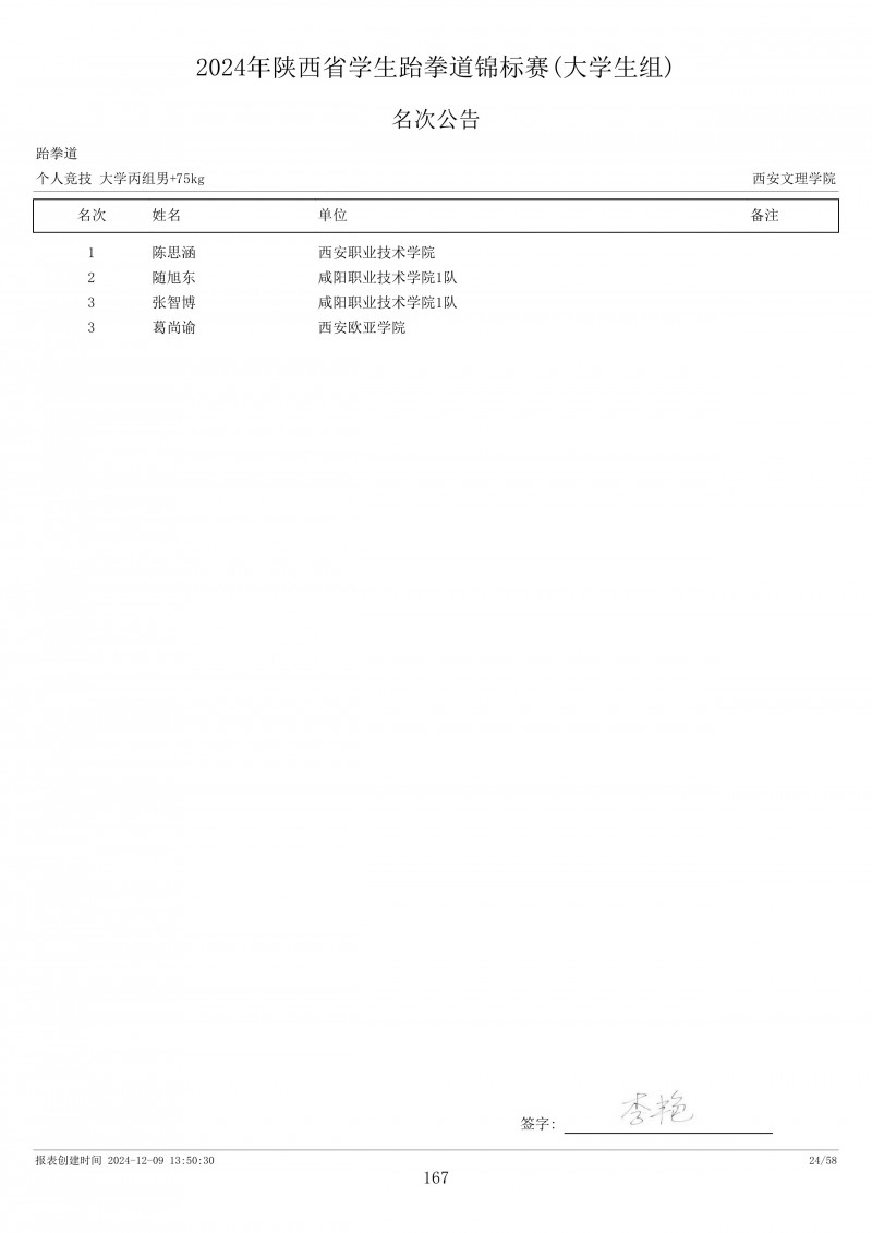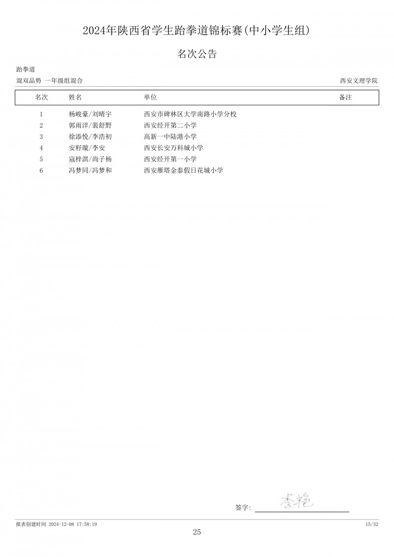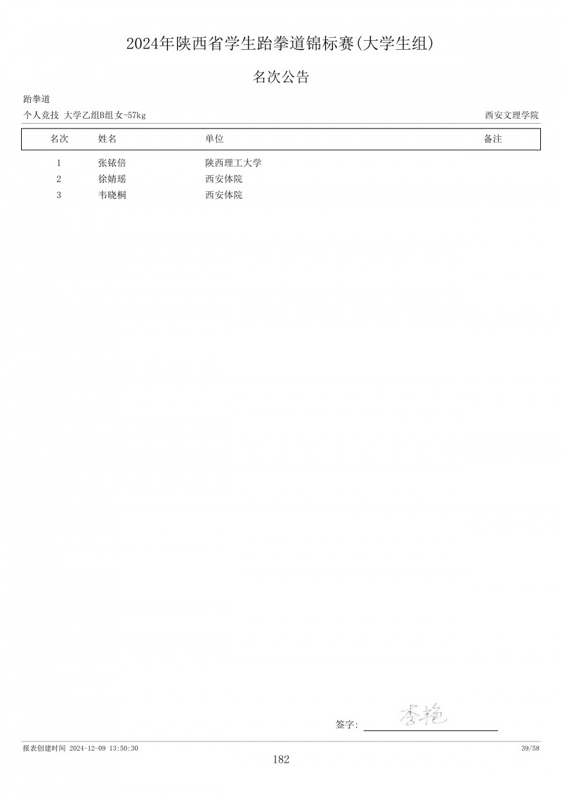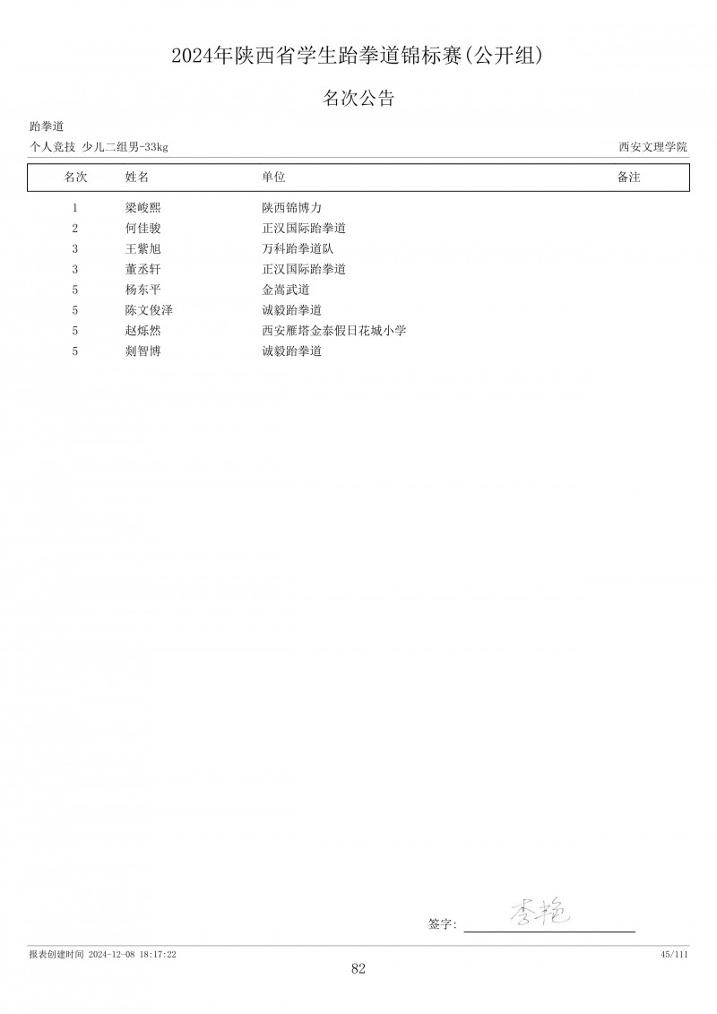 2024年陕西省学生跆拳道锦标赛成绩册