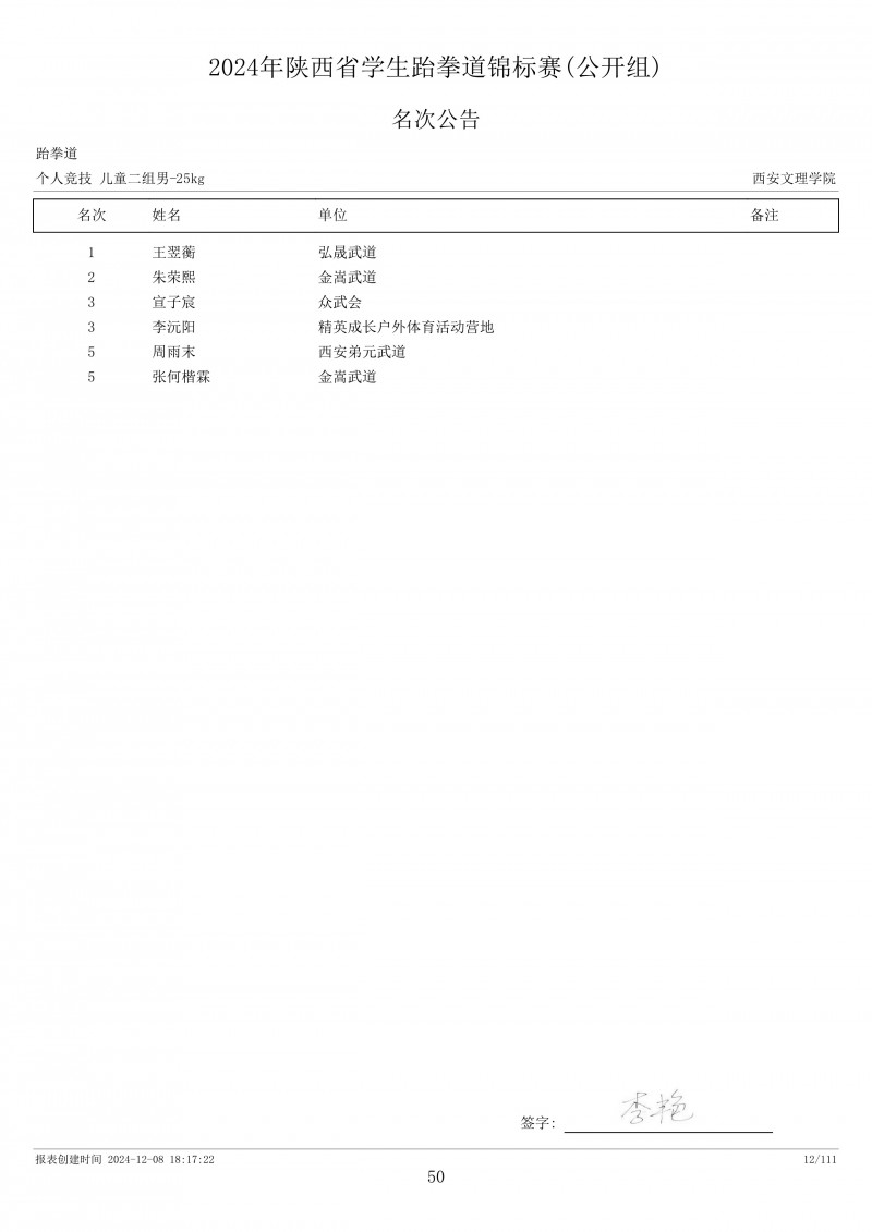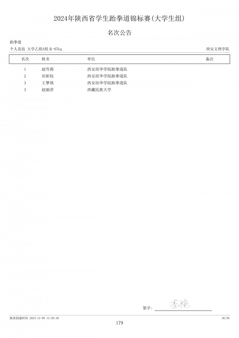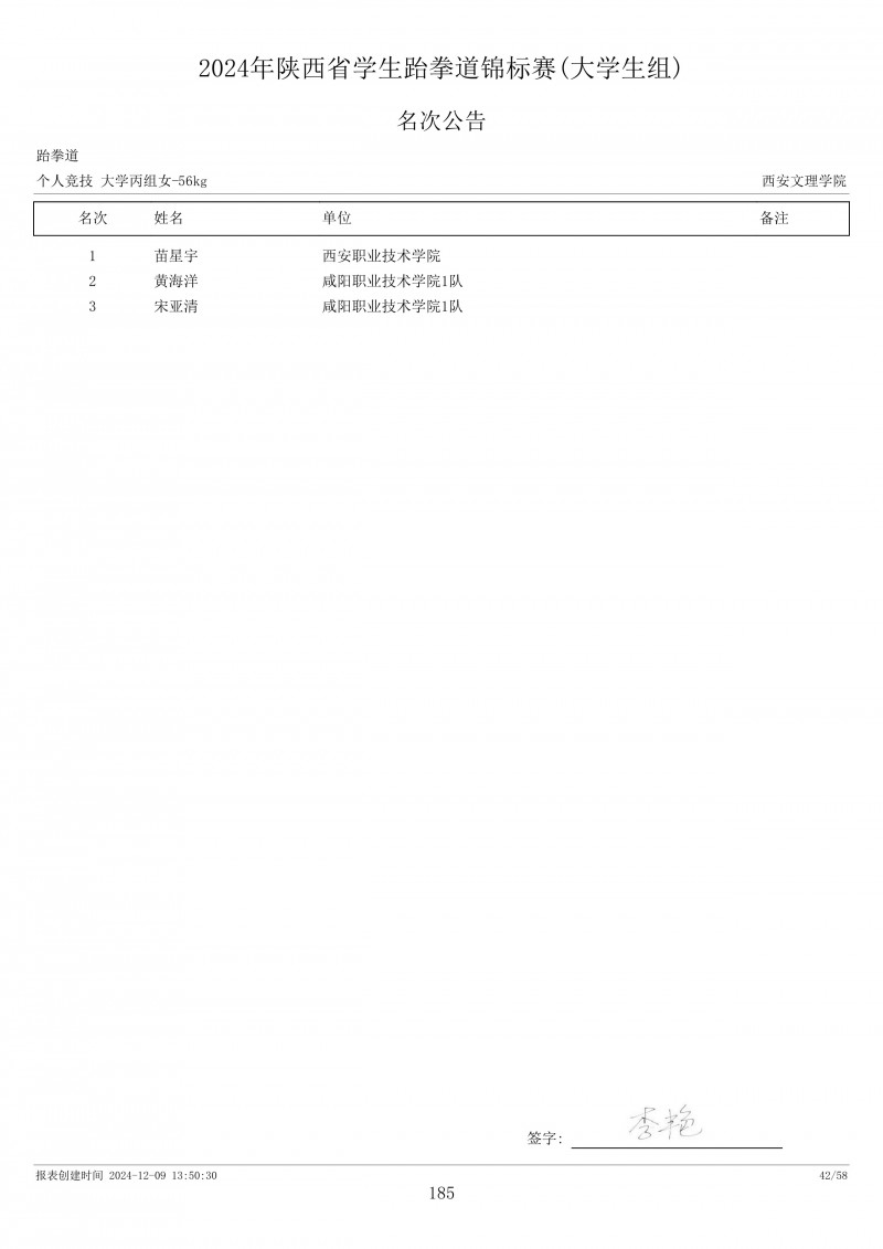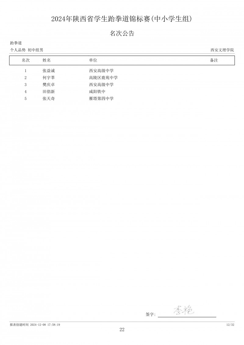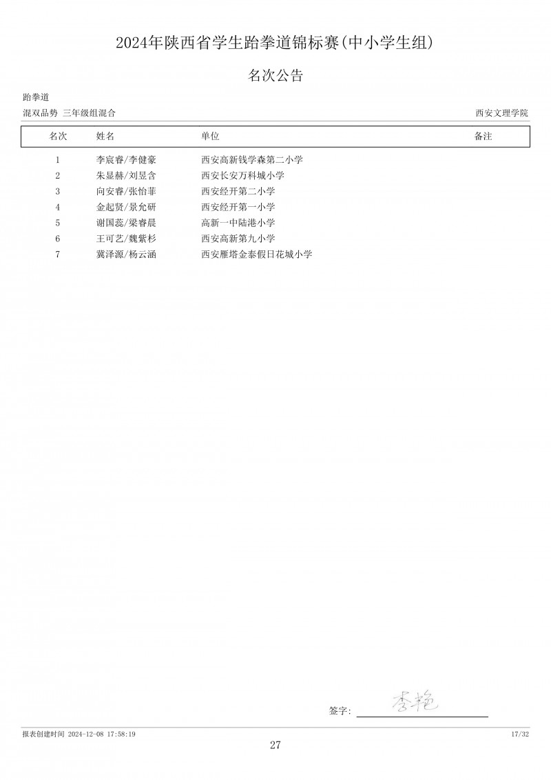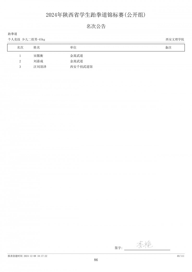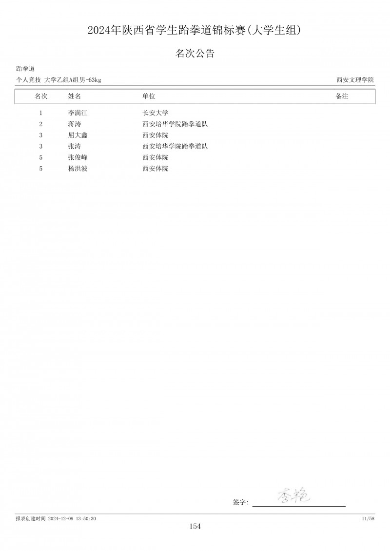 2024年陕西省学生跆拳道锦标赛成绩册