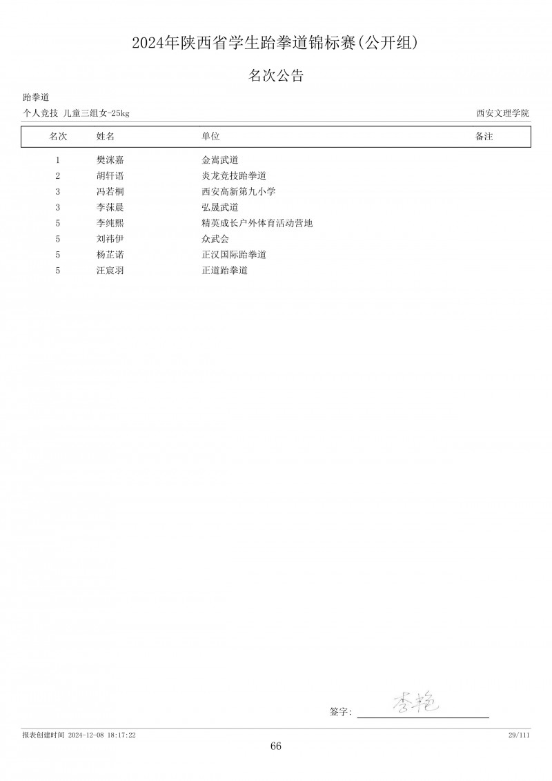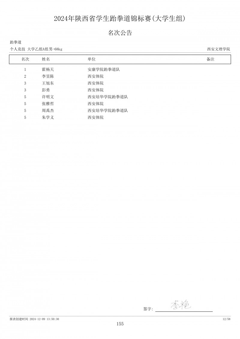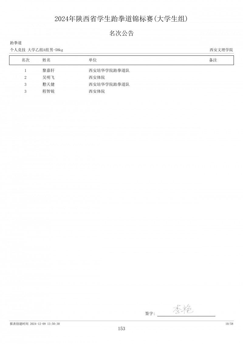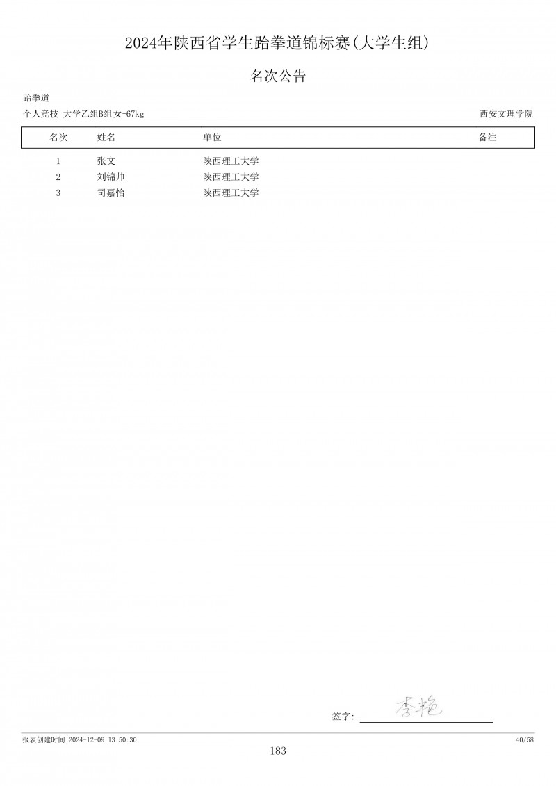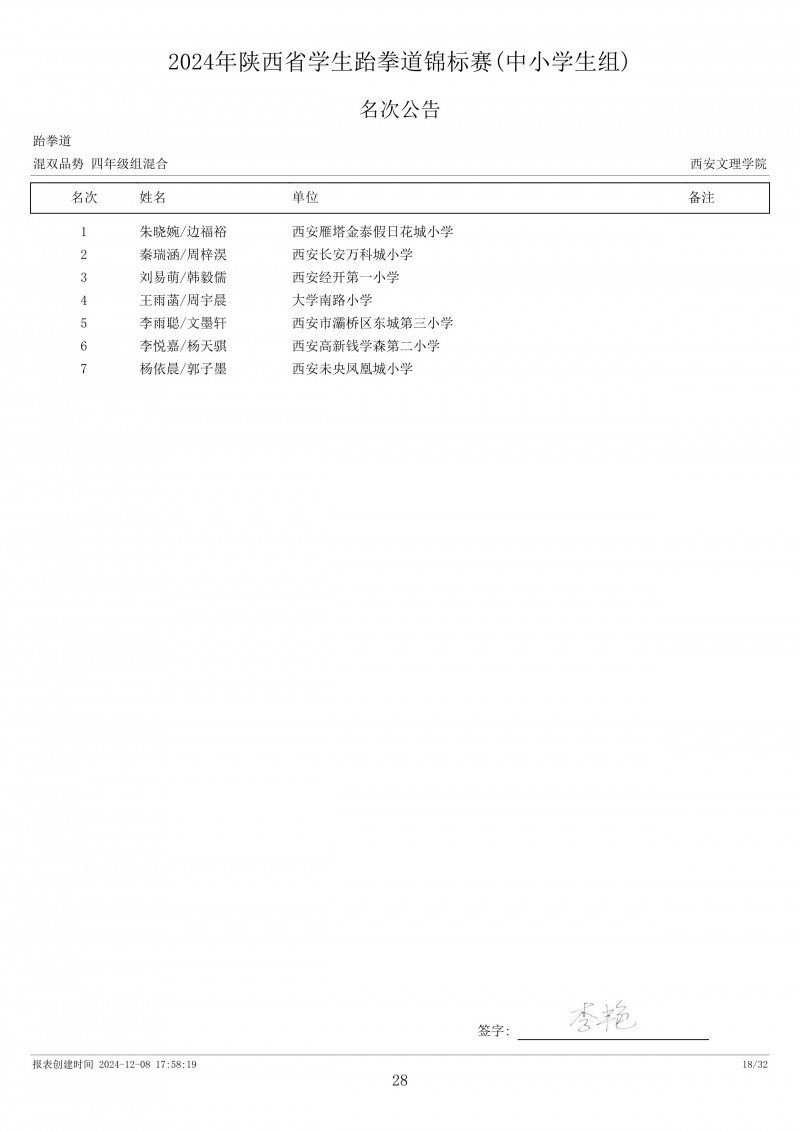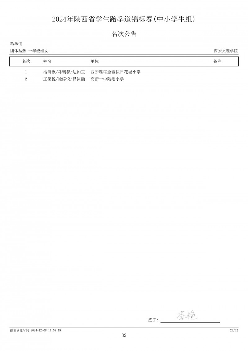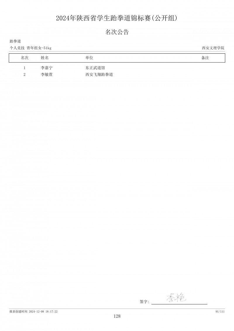 2024年陕西省学生跆拳道锦标赛成绩册