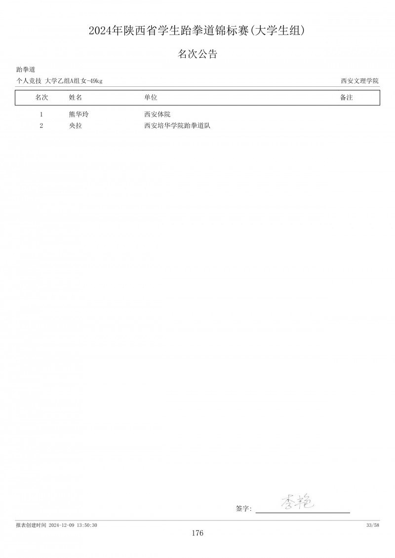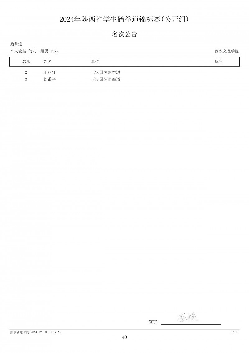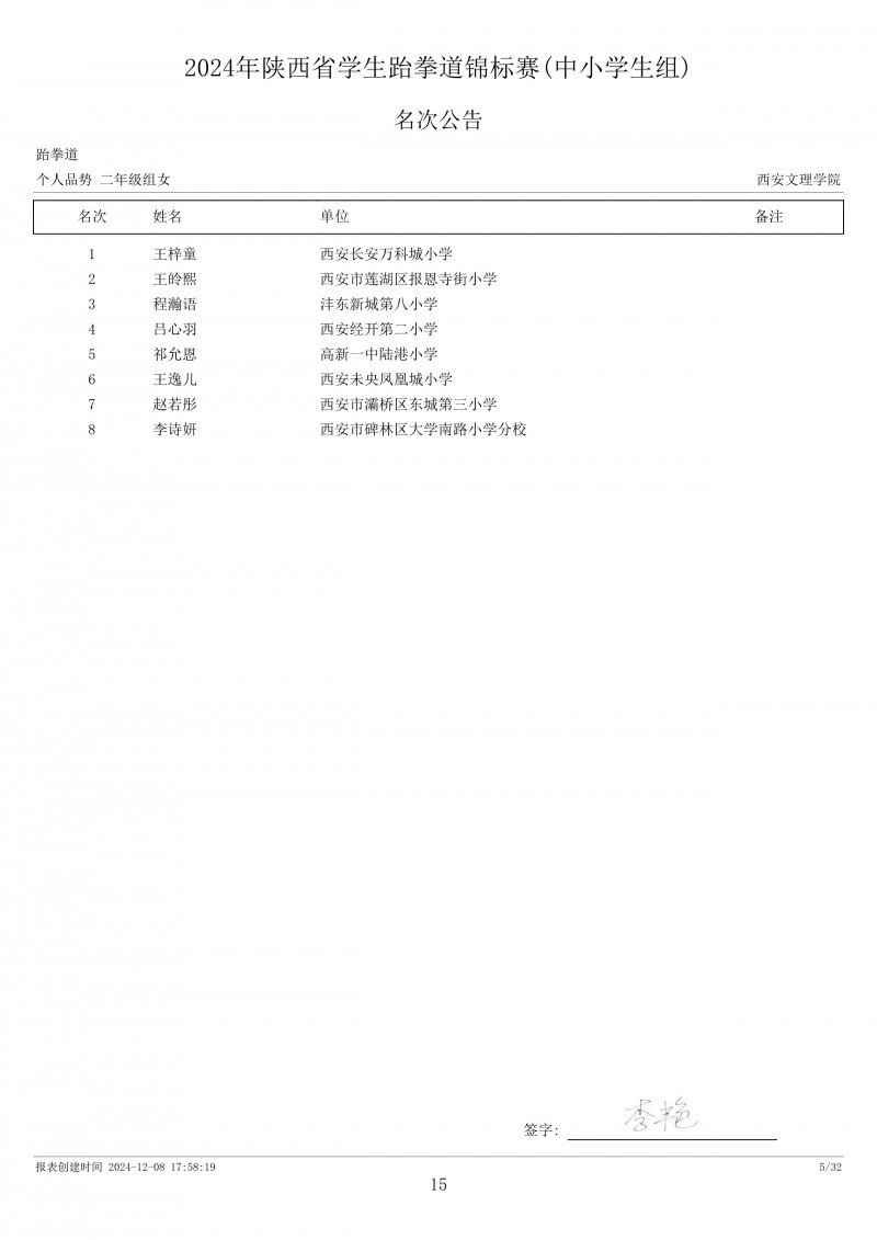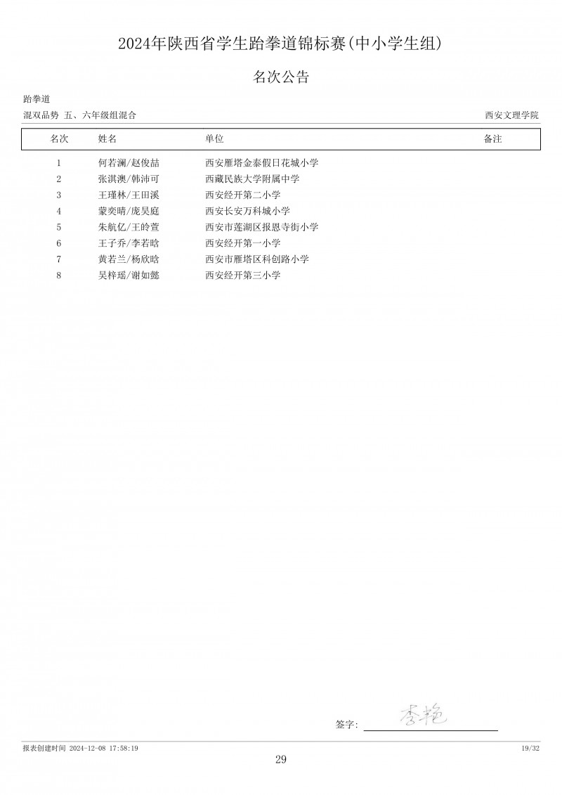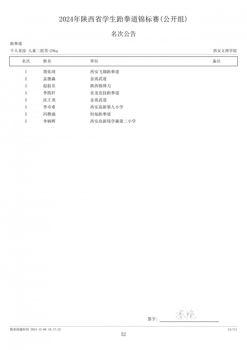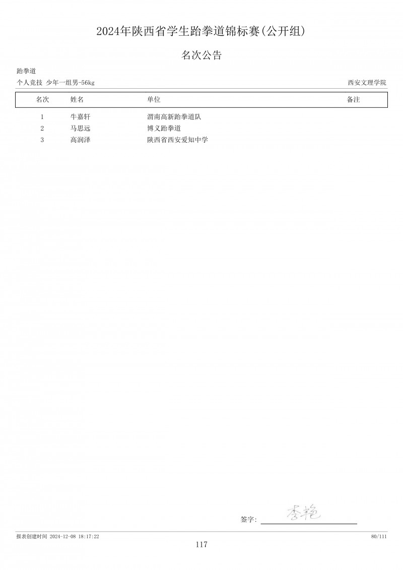 2024年陕西省学生跆拳道锦标赛成绩册