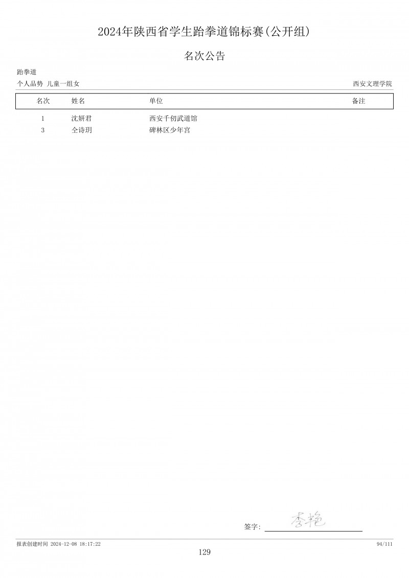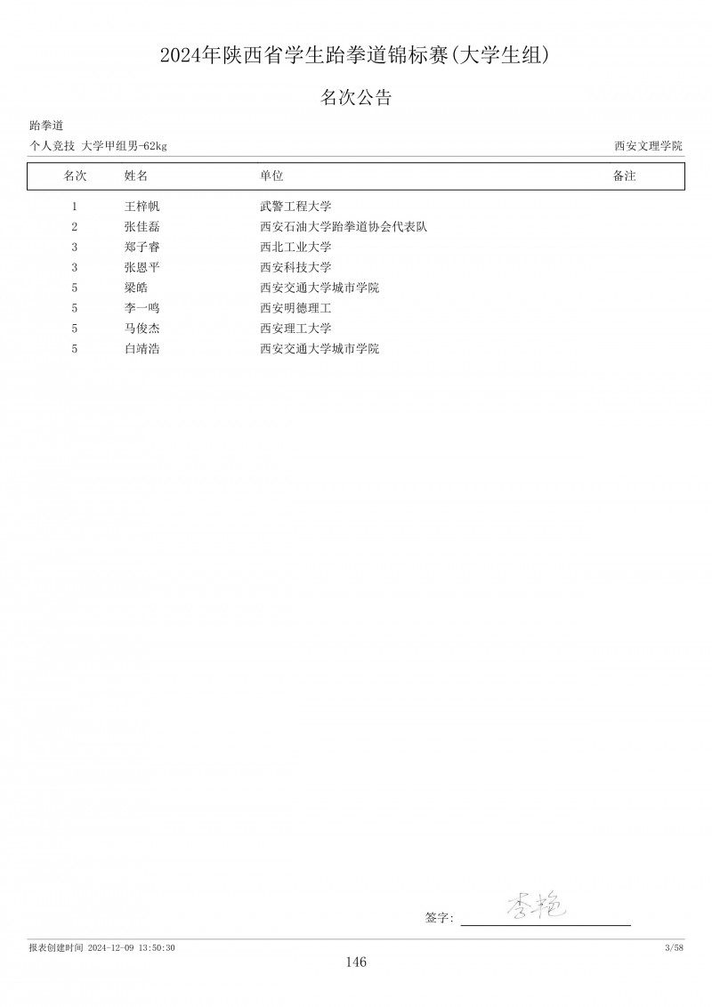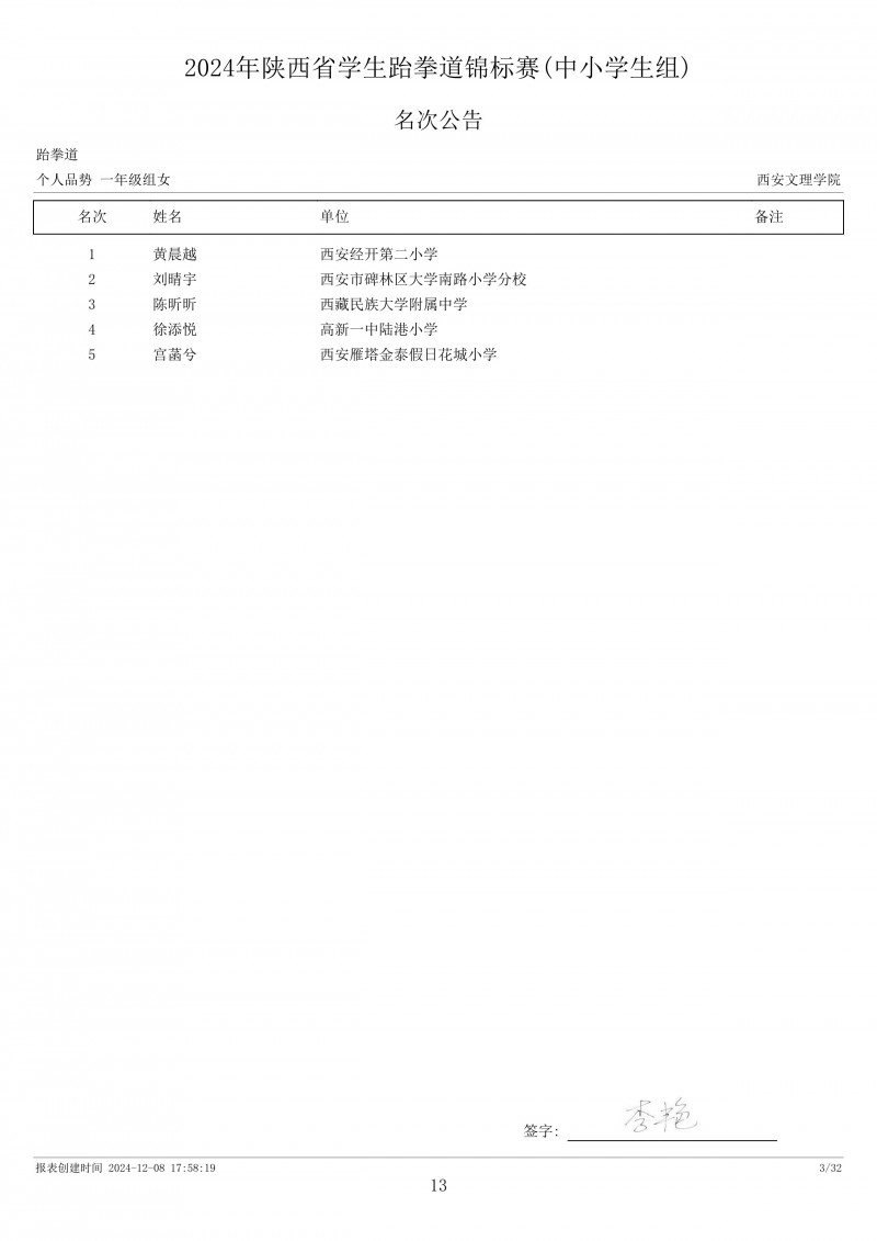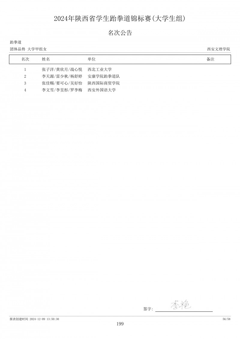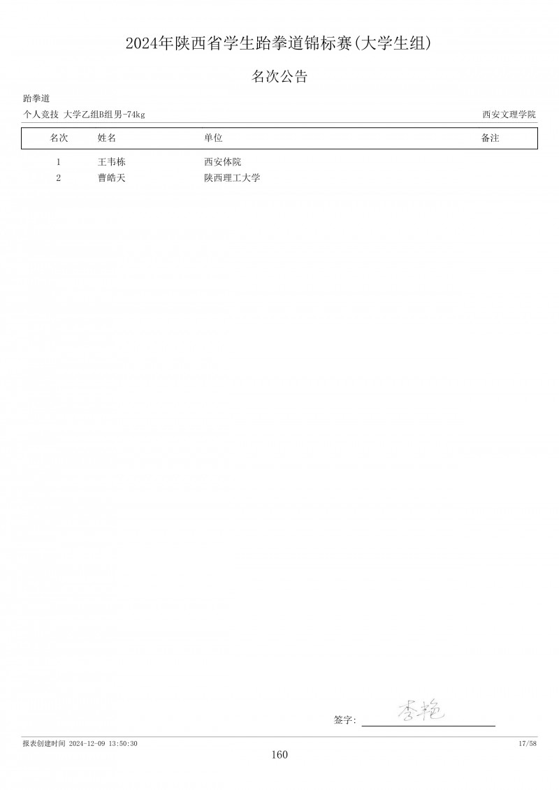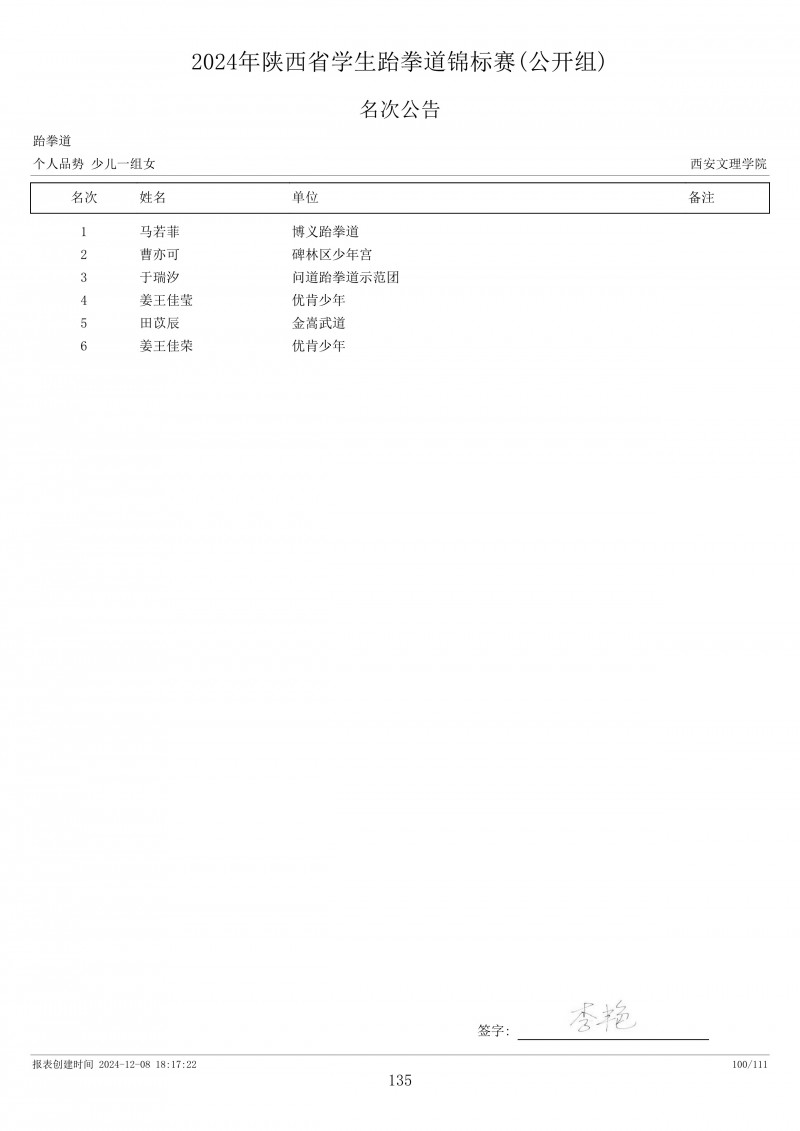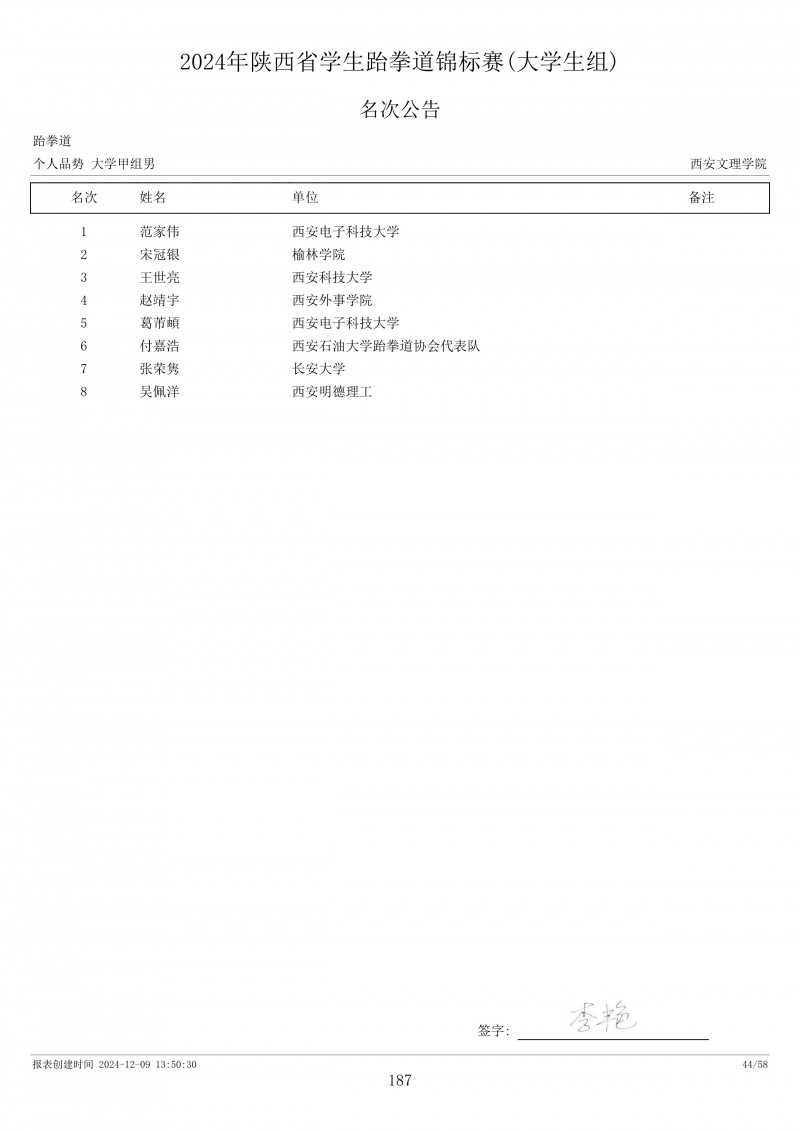 2024年陕西省学生跆拳道锦标赛成绩册