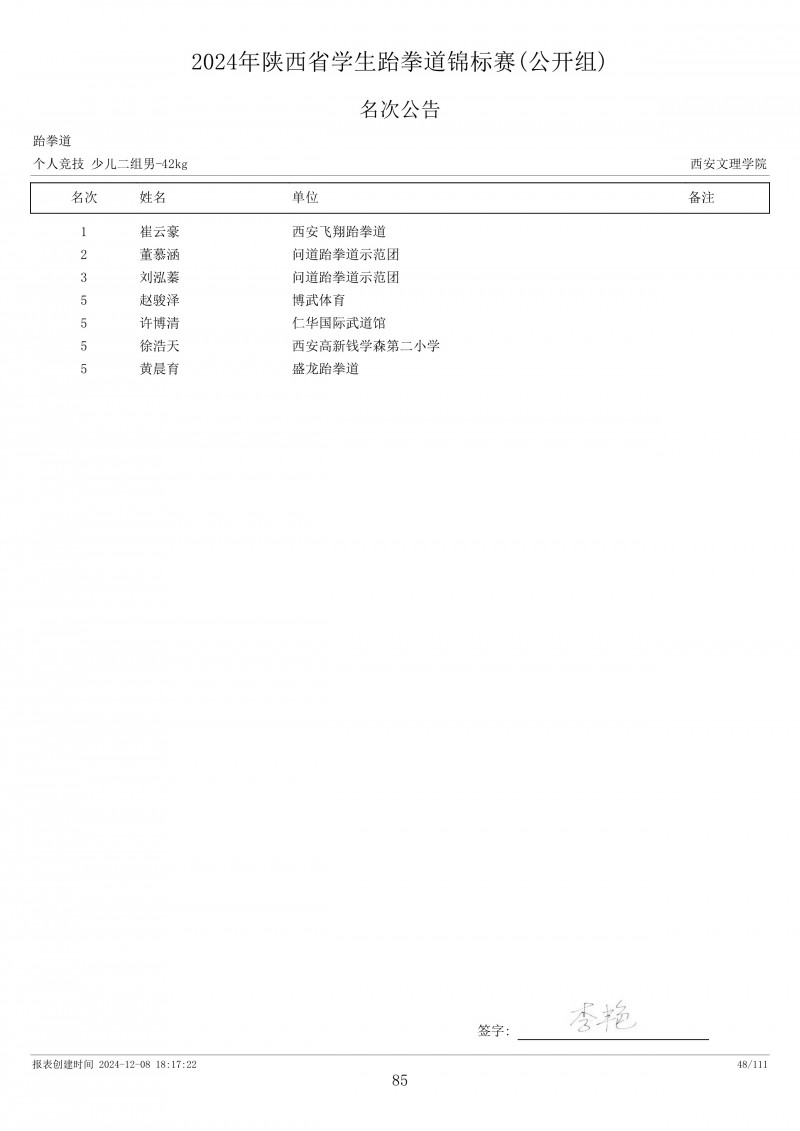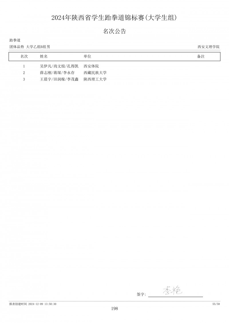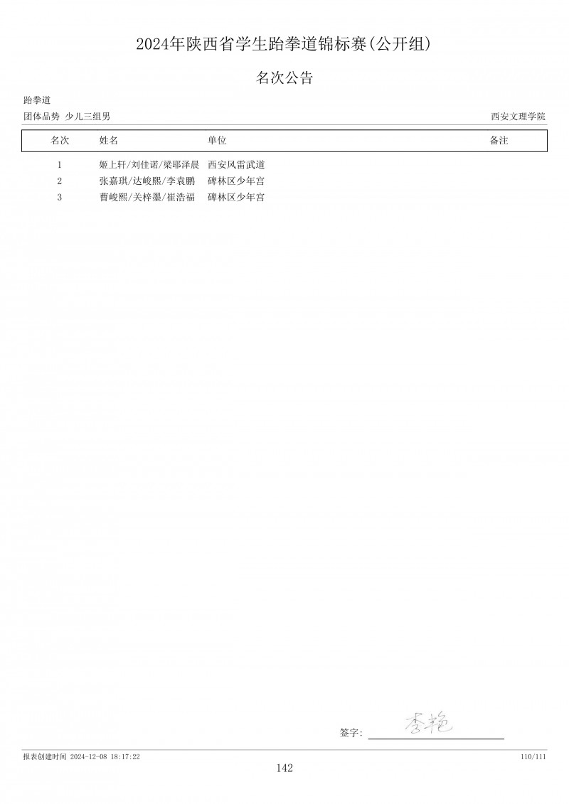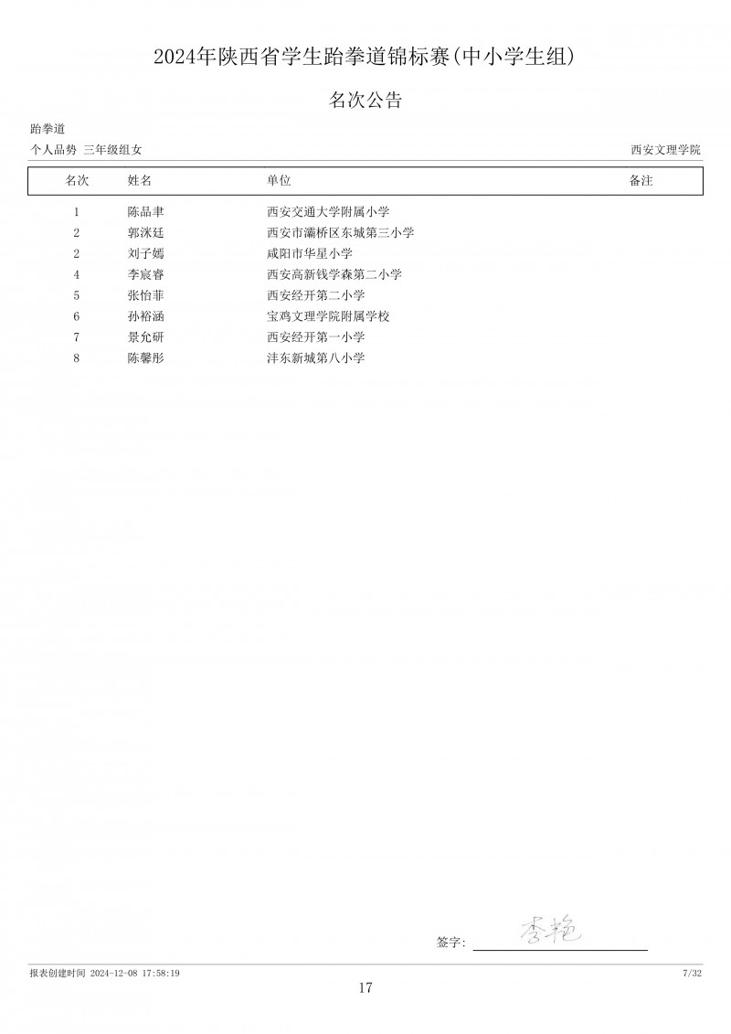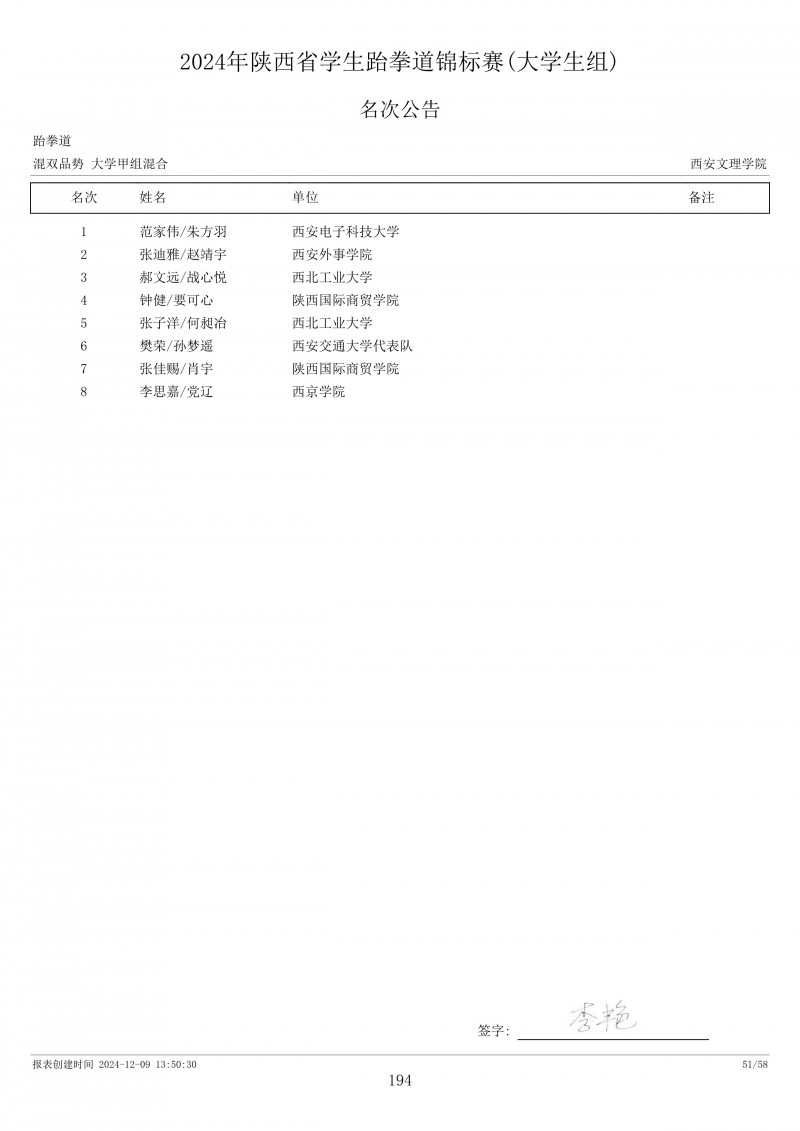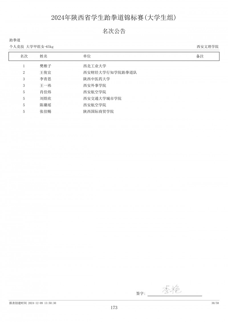 2024年陕西省学生跆拳道锦标赛成绩册
