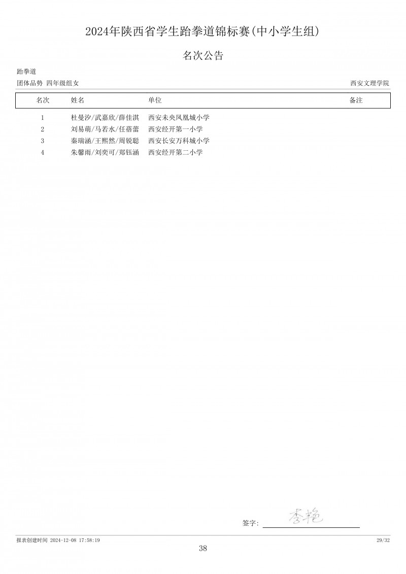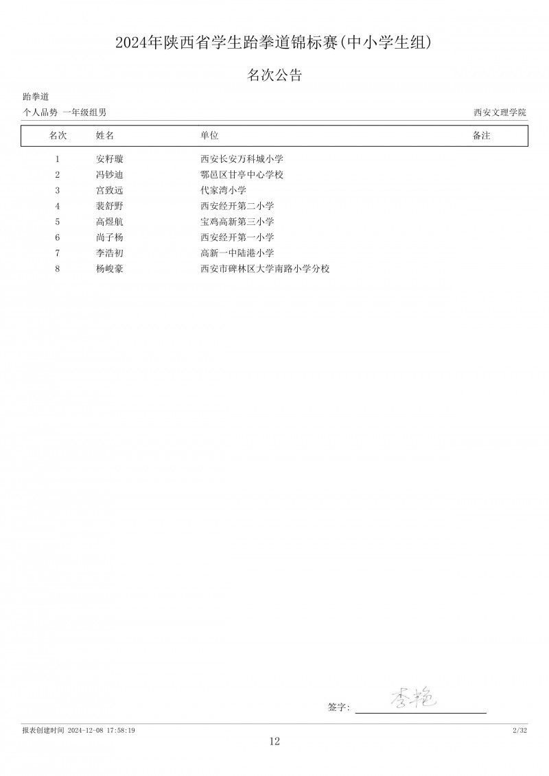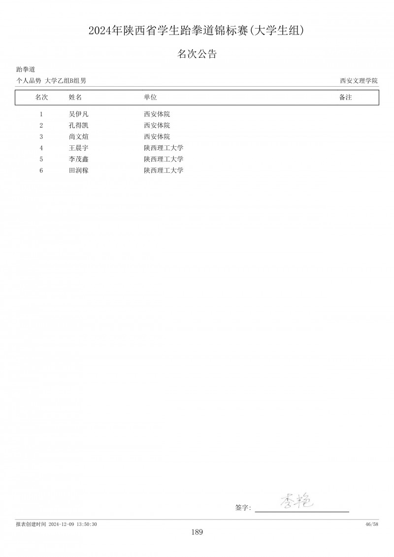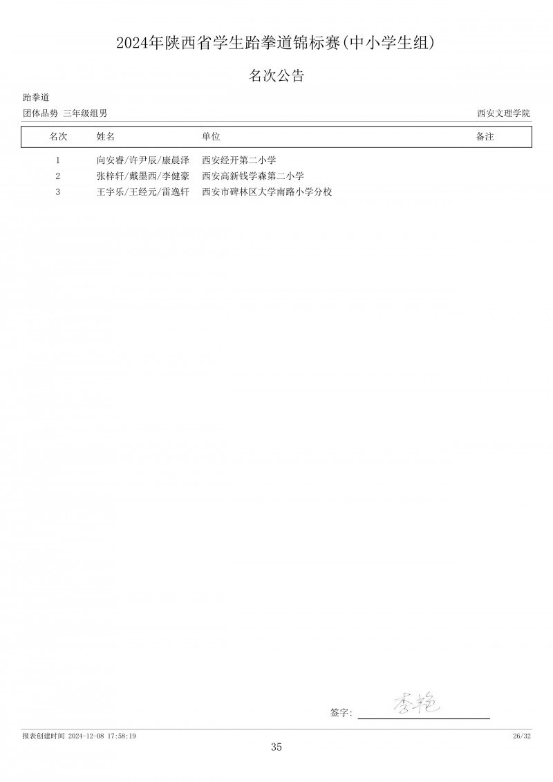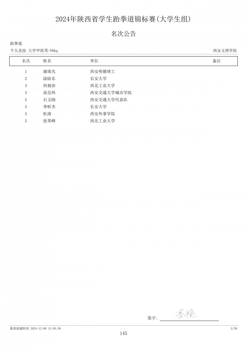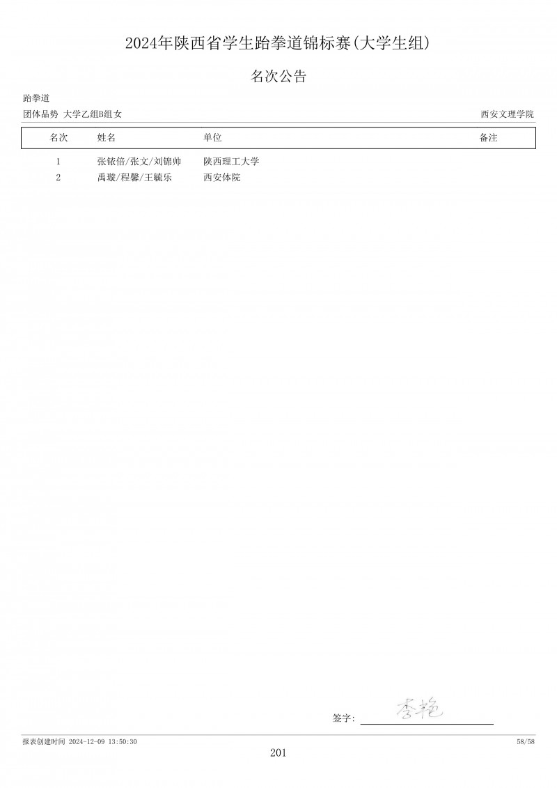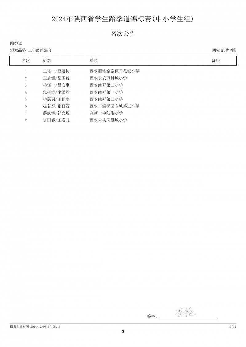 2024年陕西省学生跆拳道锦标赛成绩册