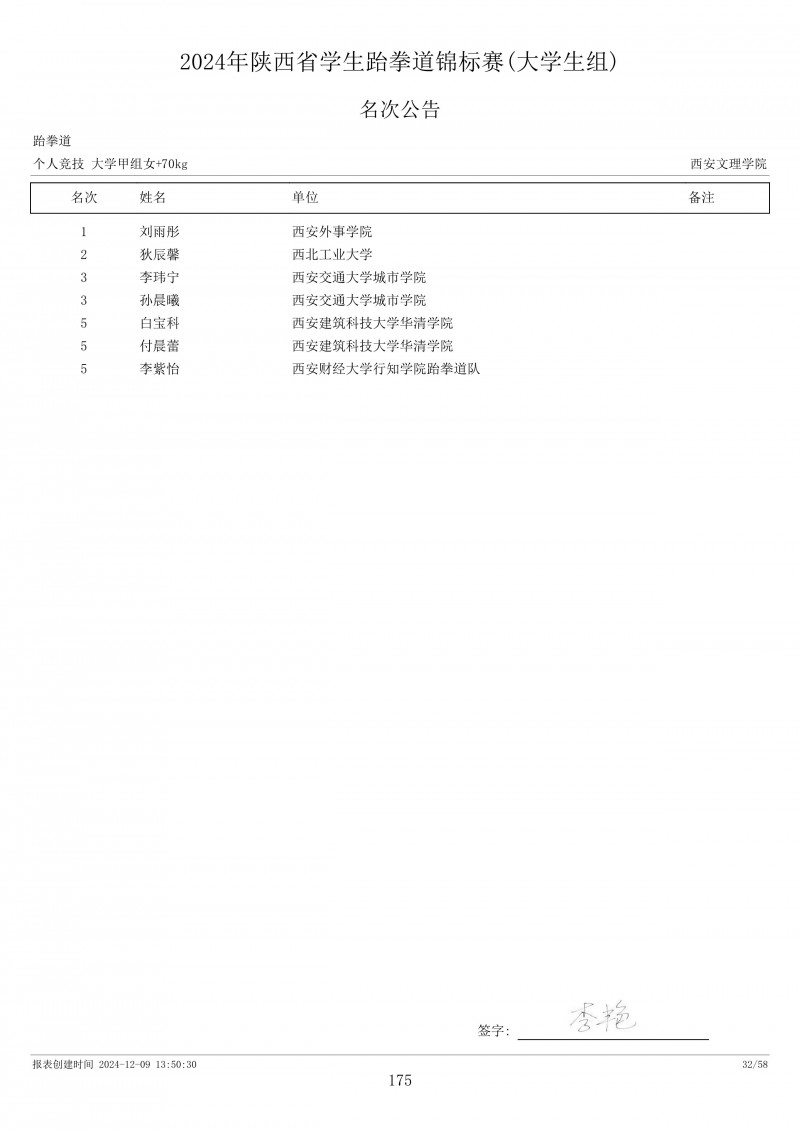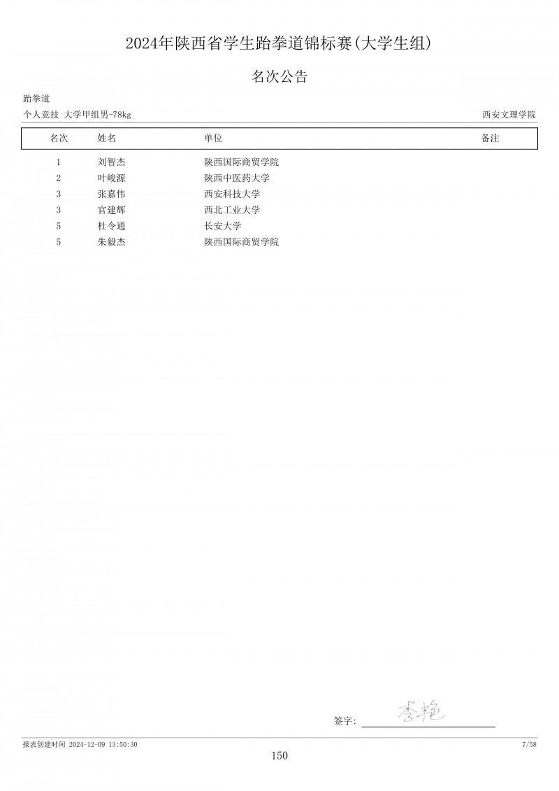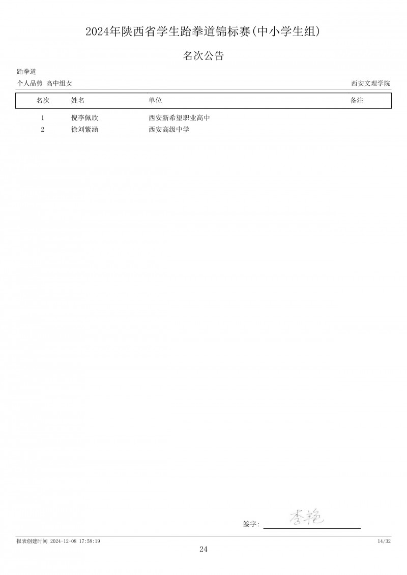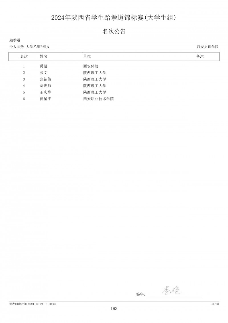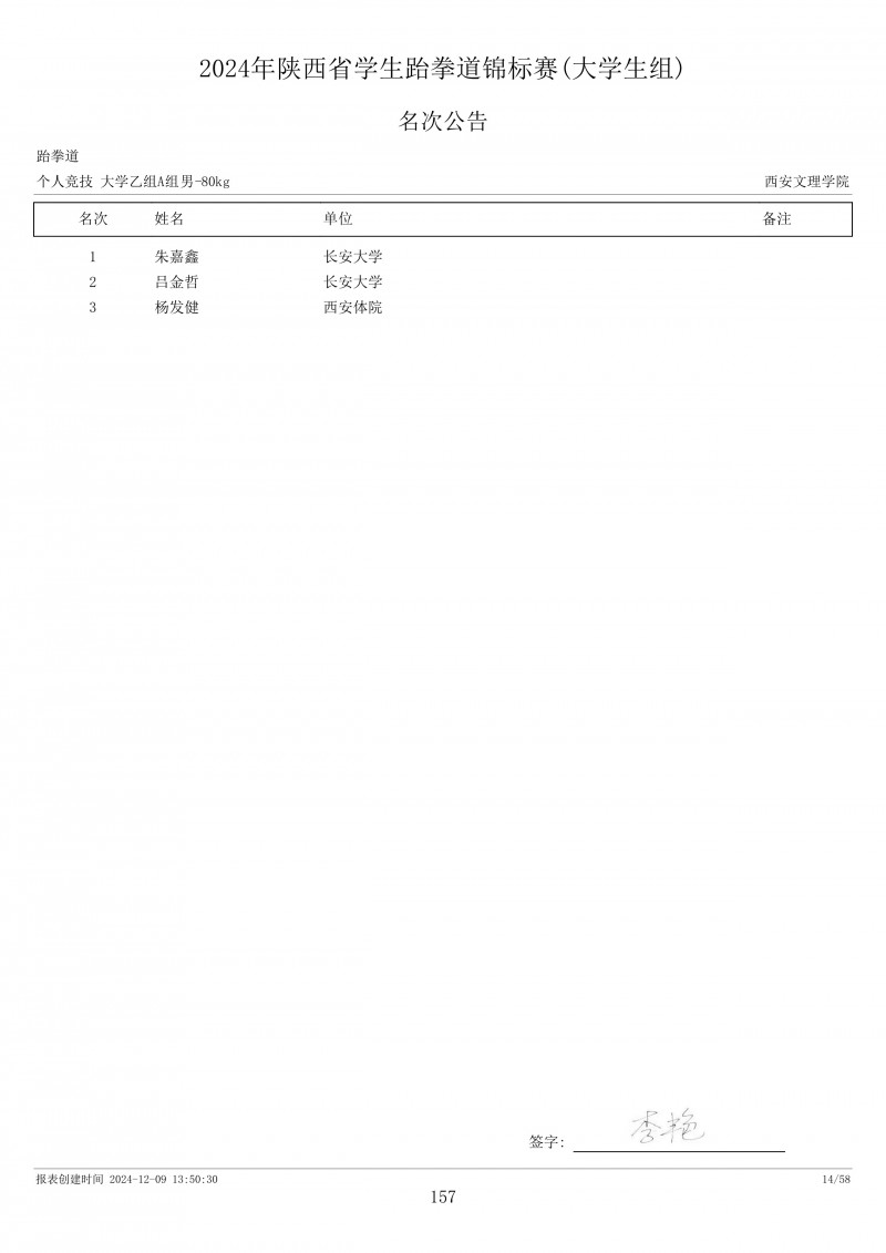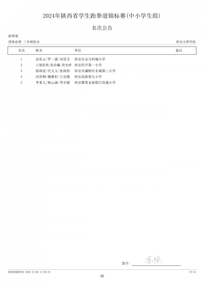 2024年陕西省学生跆拳道锦标赛成绩册