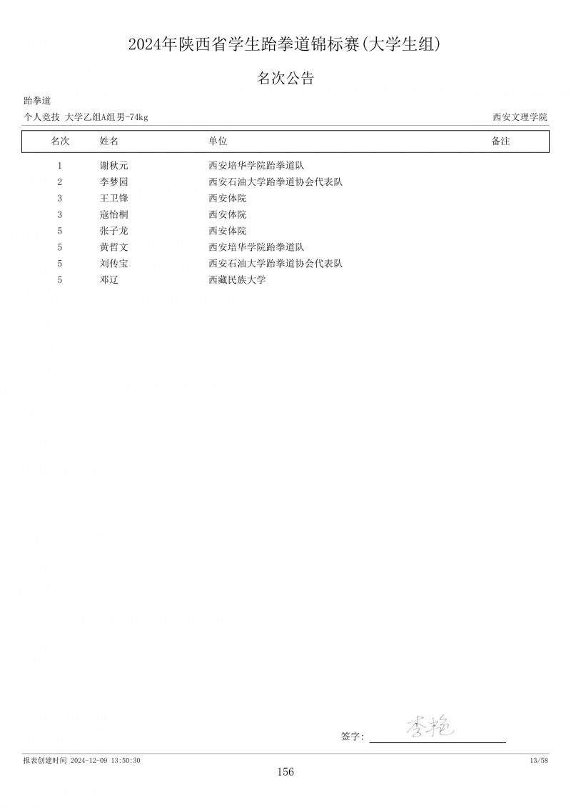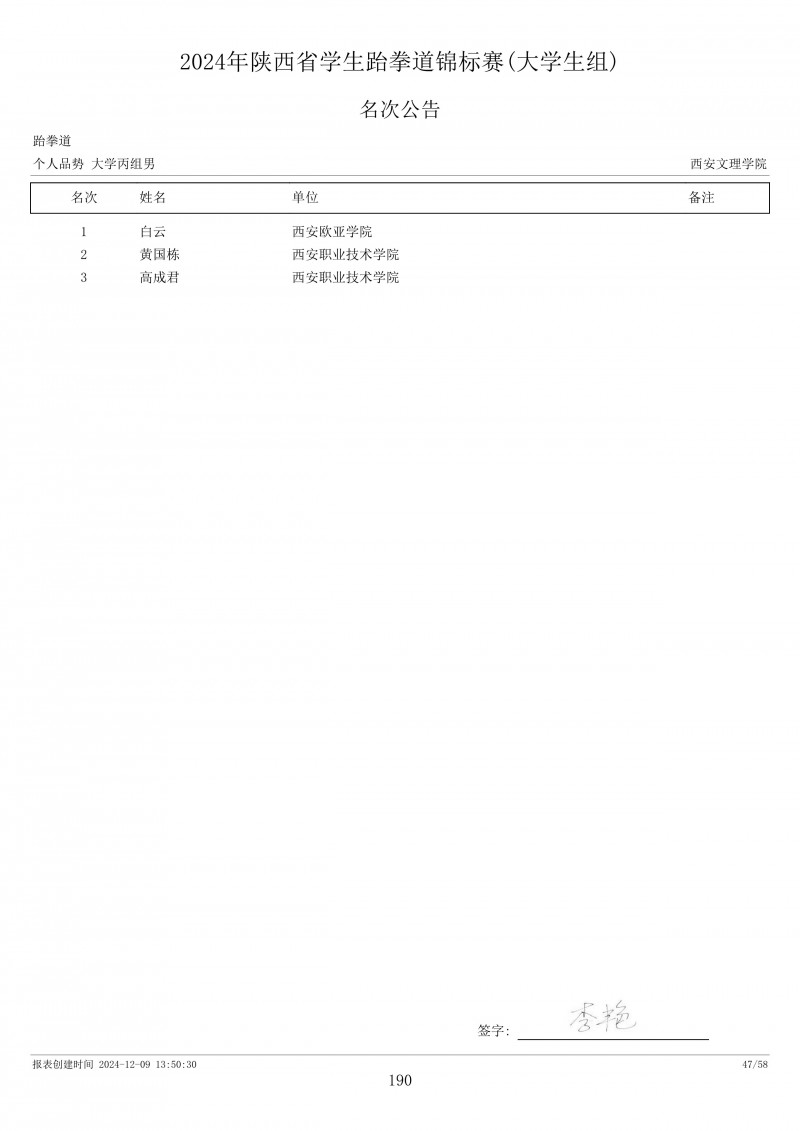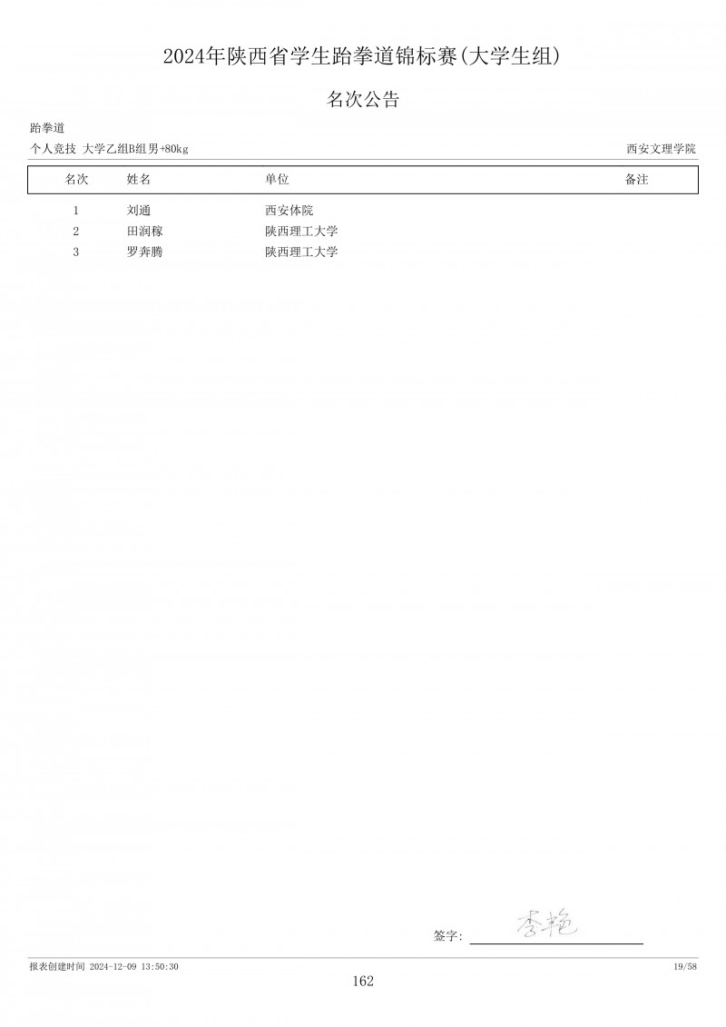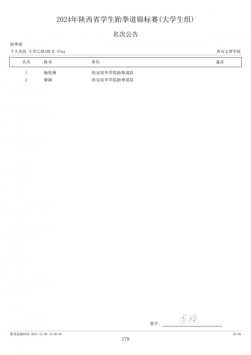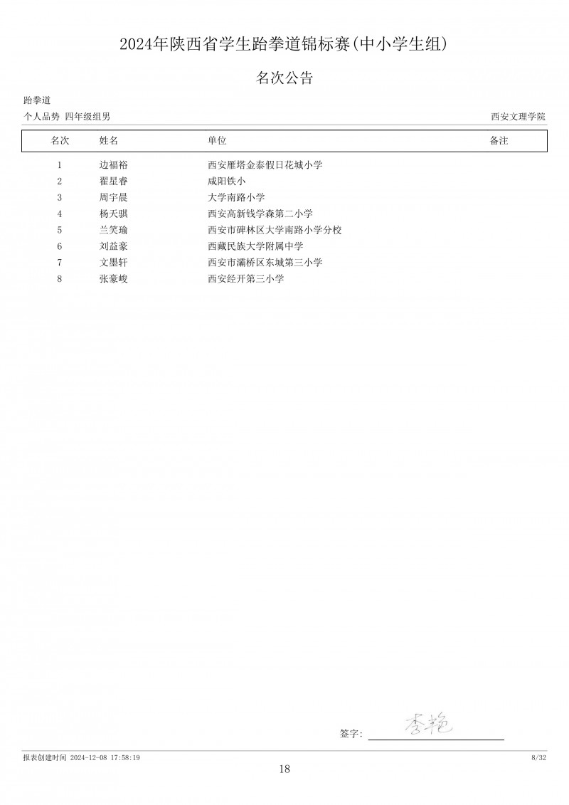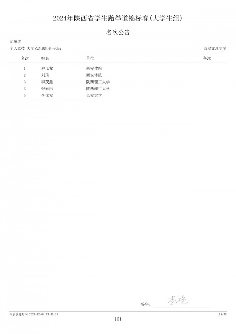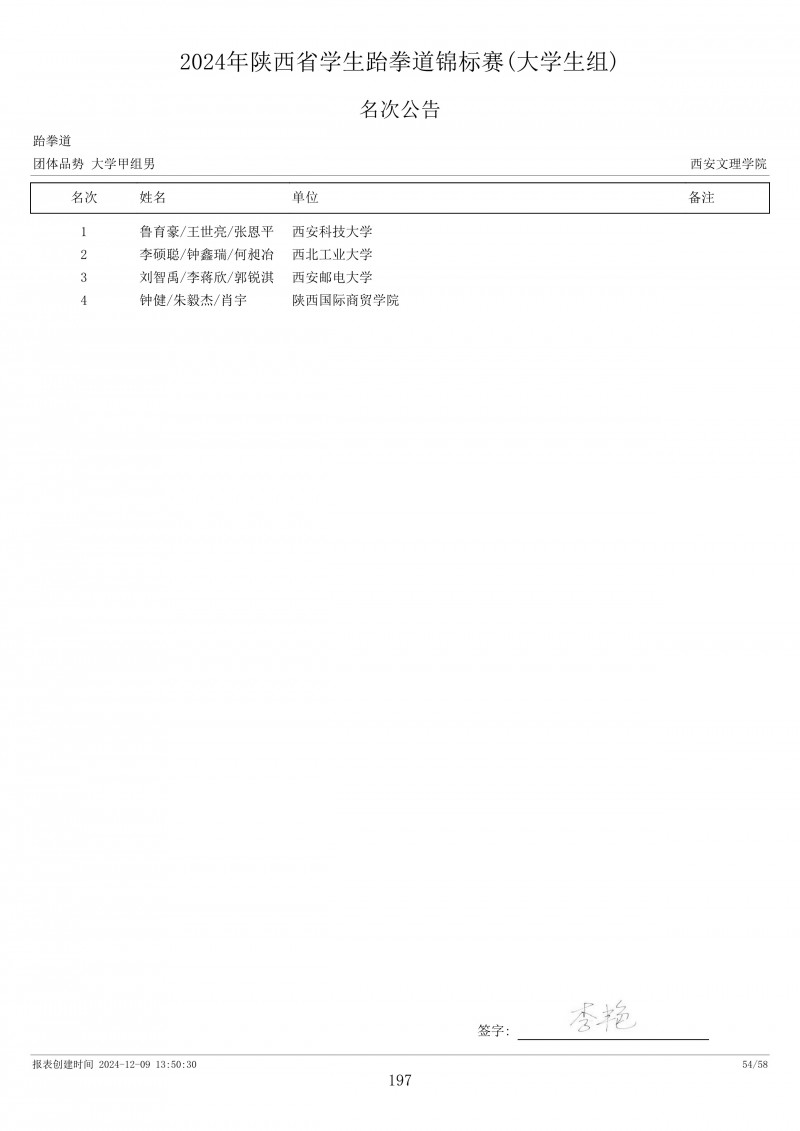 2024年陕西省学生跆拳道锦标赛成绩册