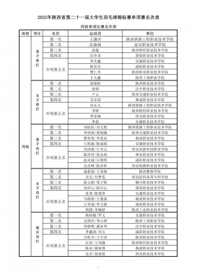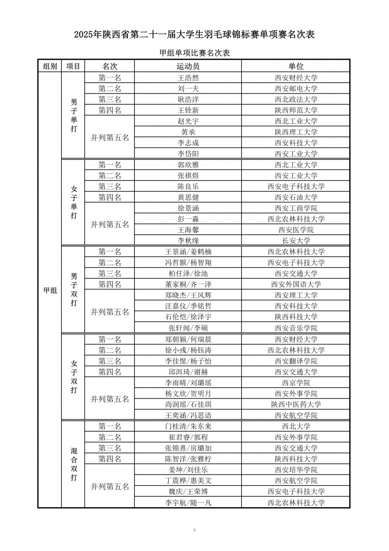 2025年陕西省大学生羽毛球锦标赛暨“校长杯”比赛成绩册
