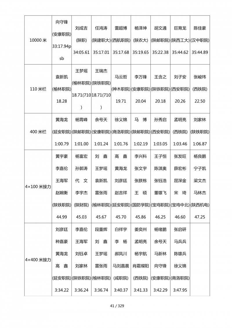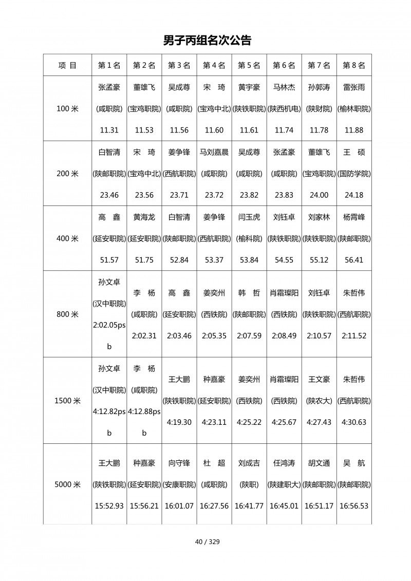 陕西省第四十届大学生田径运动会总成绩册