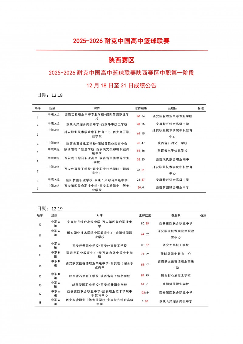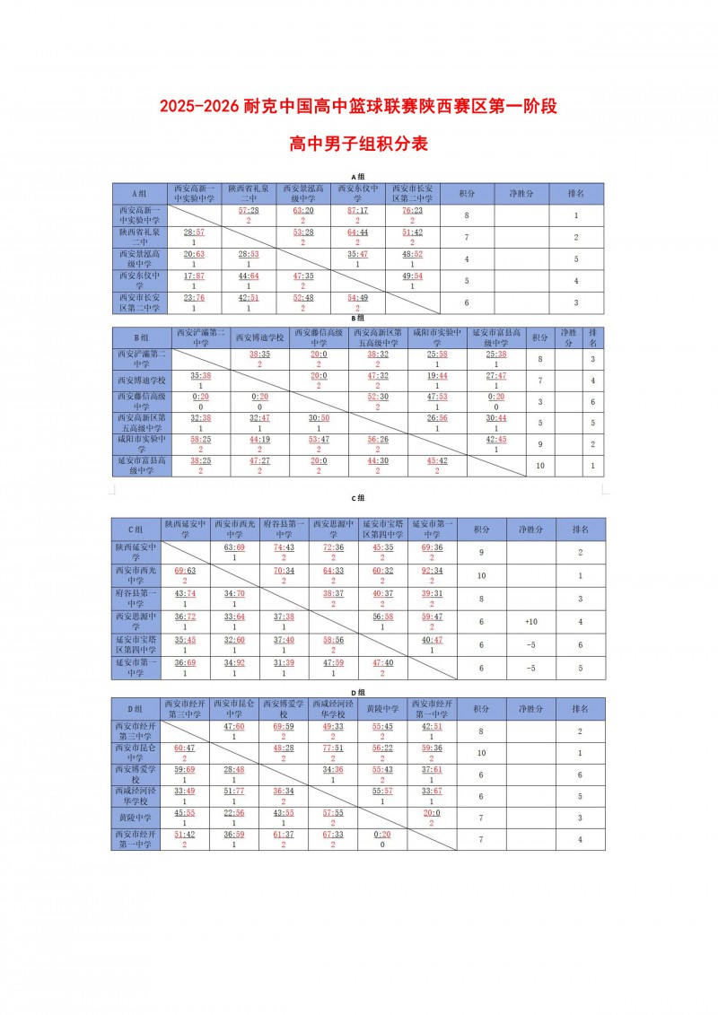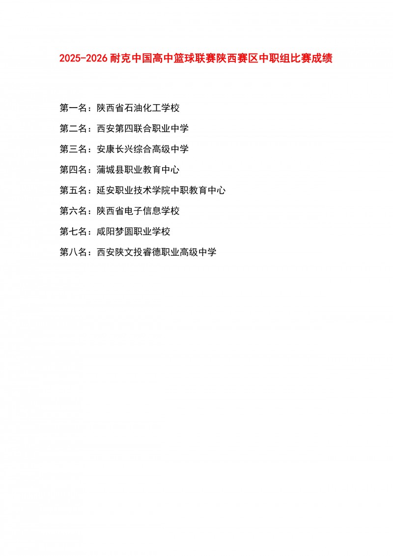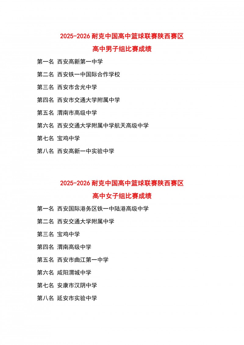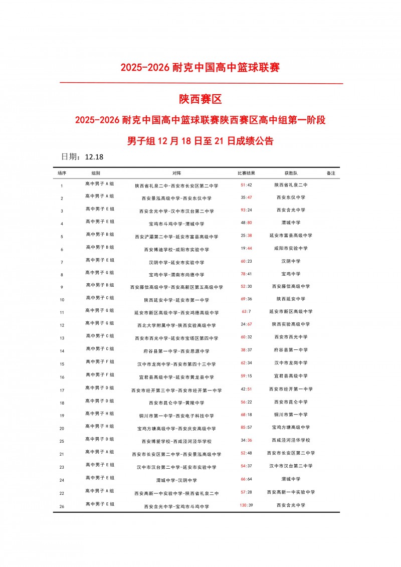 2025-2026耐克中国高中篮球联赛陕西赛区成绩册
