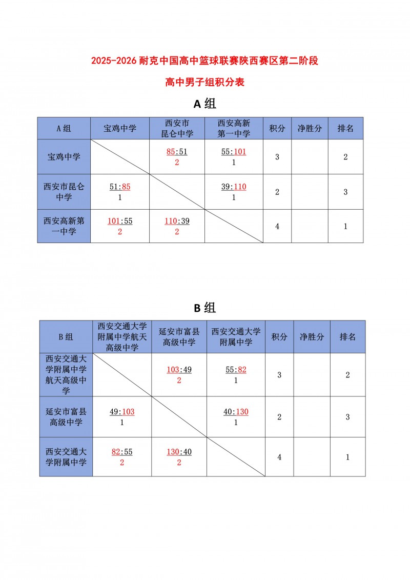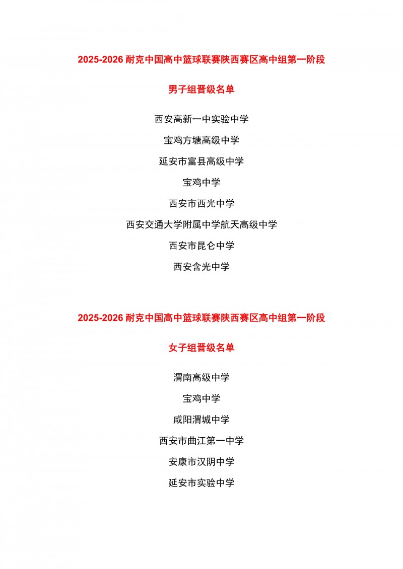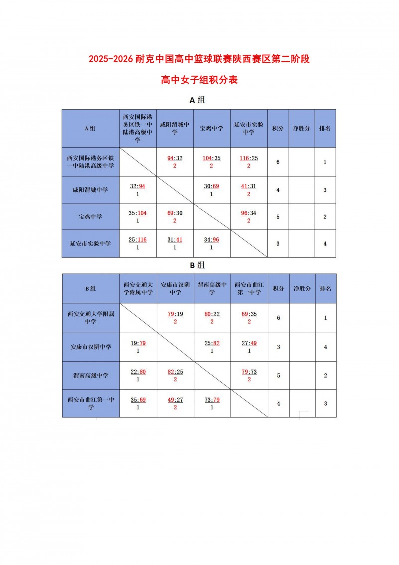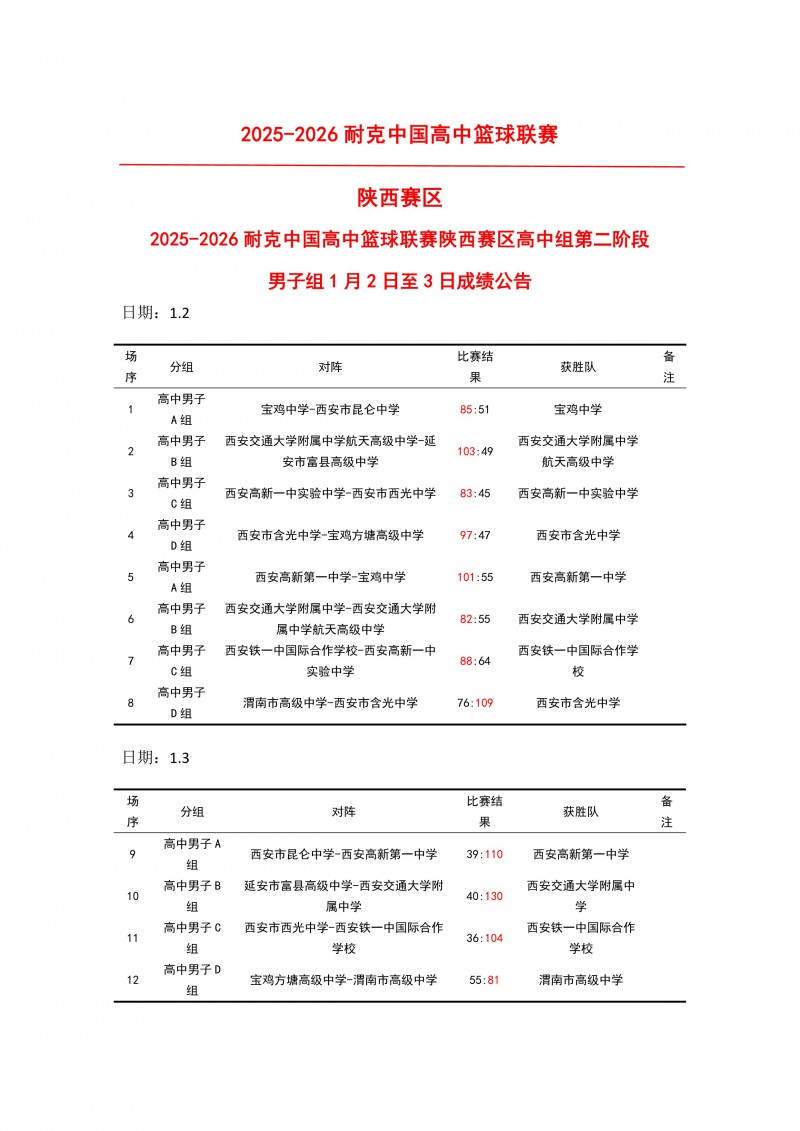 2025-2026耐克中国高中篮球联赛陕西赛区成绩册